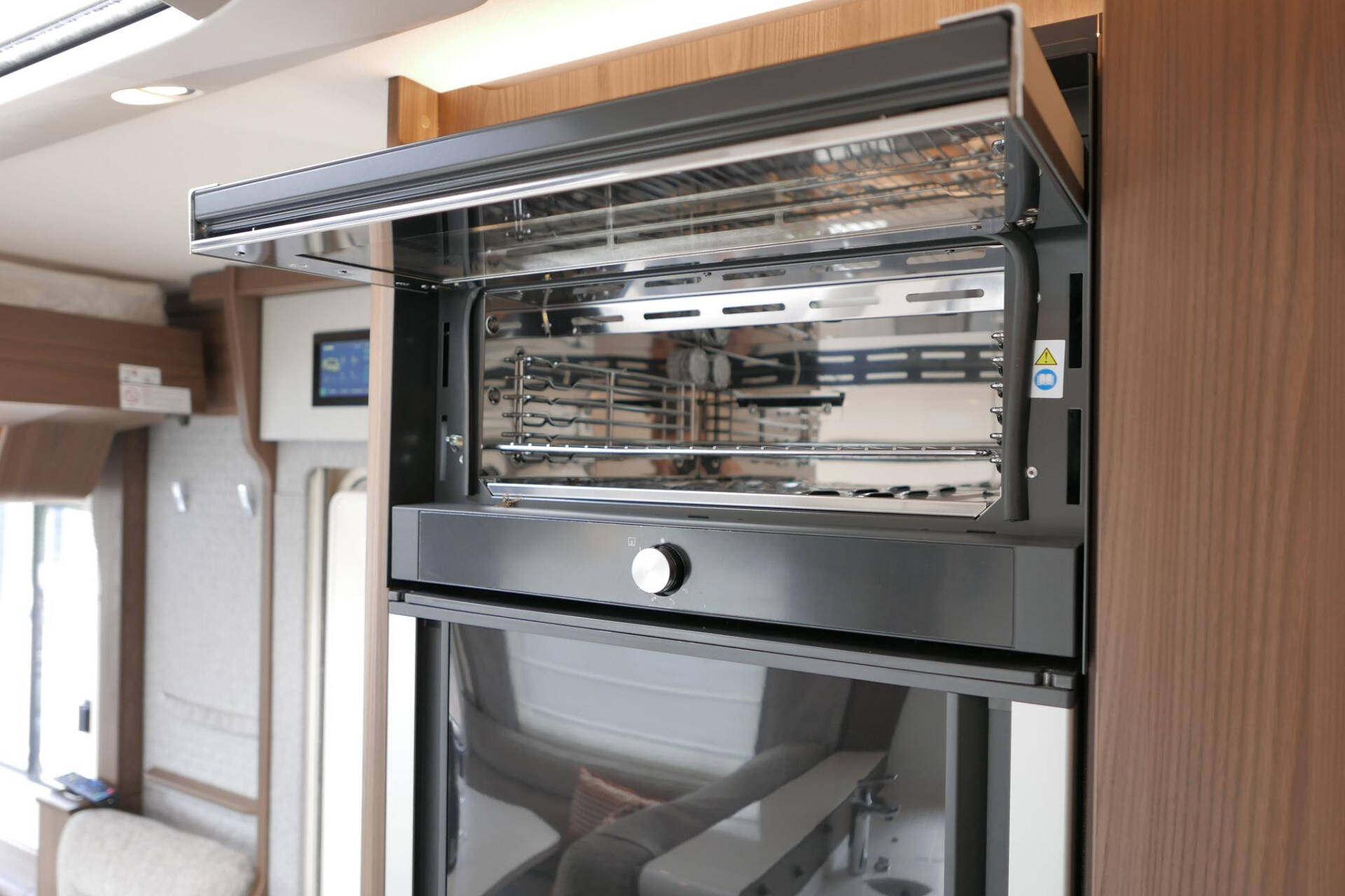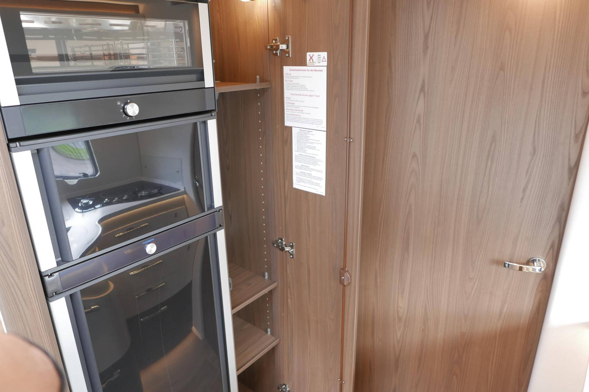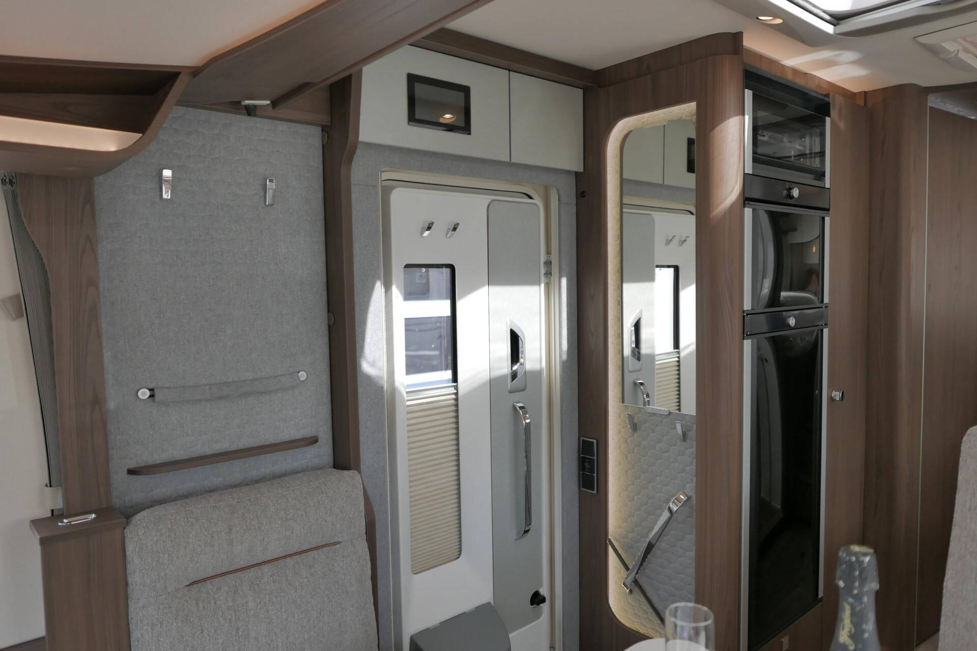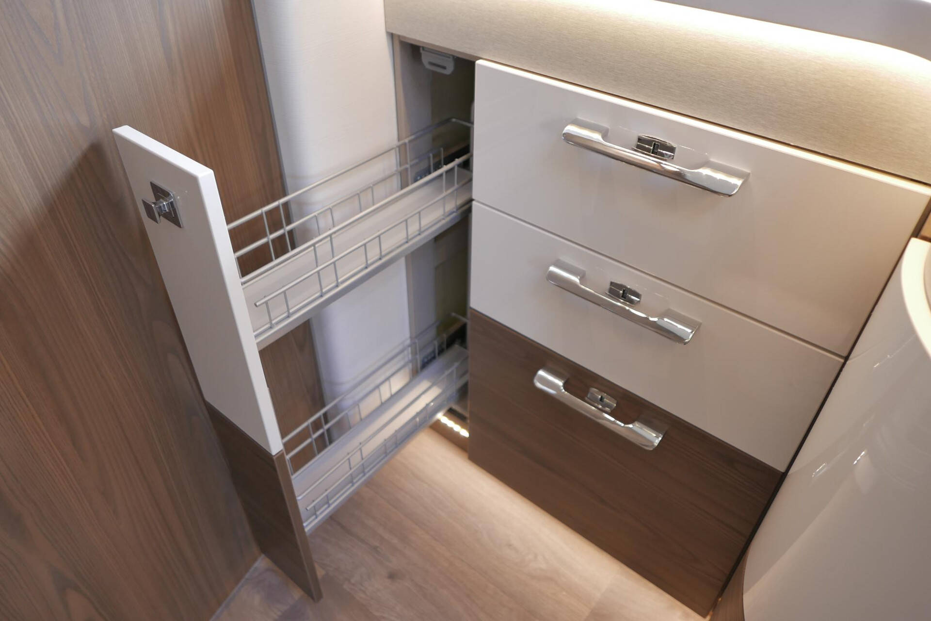 De luxe hoekkeuken is voorzien van diverse gelagerde boodschappenladen, waaronder een apothekerslade en 2 pits gasstel én een inductie kookplaat. Hier tegenover bevindt zich de grote TecTower koelkast met aparte vriezer en automatische omschakeling 230V/12V/gas. De deuren zijn zowel links als rechts scharnierend, zodat u vanuit de keuken én vanuit de woonruimte makkelijk in de koelkast kunt.