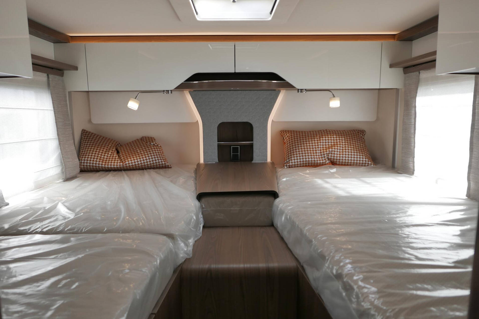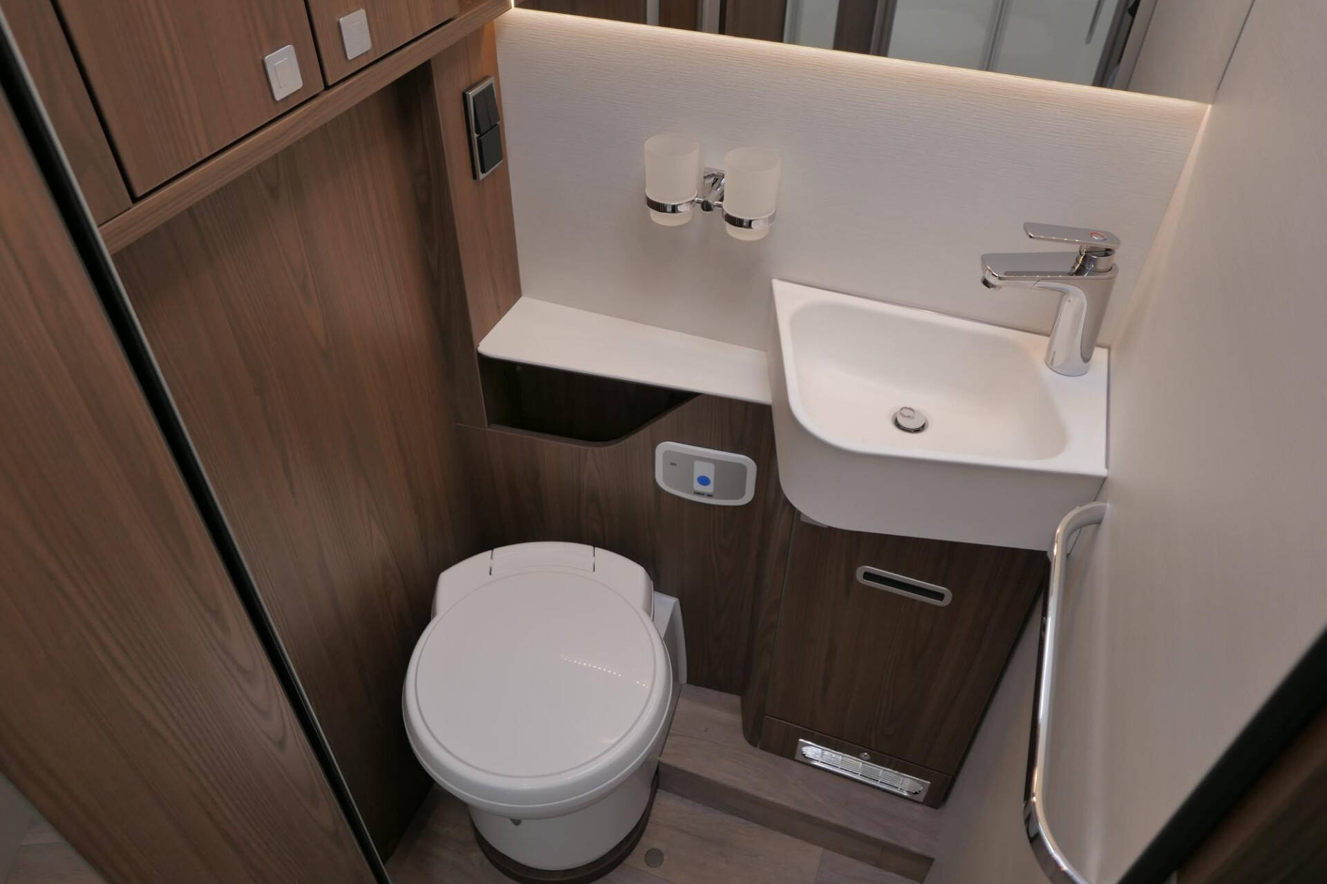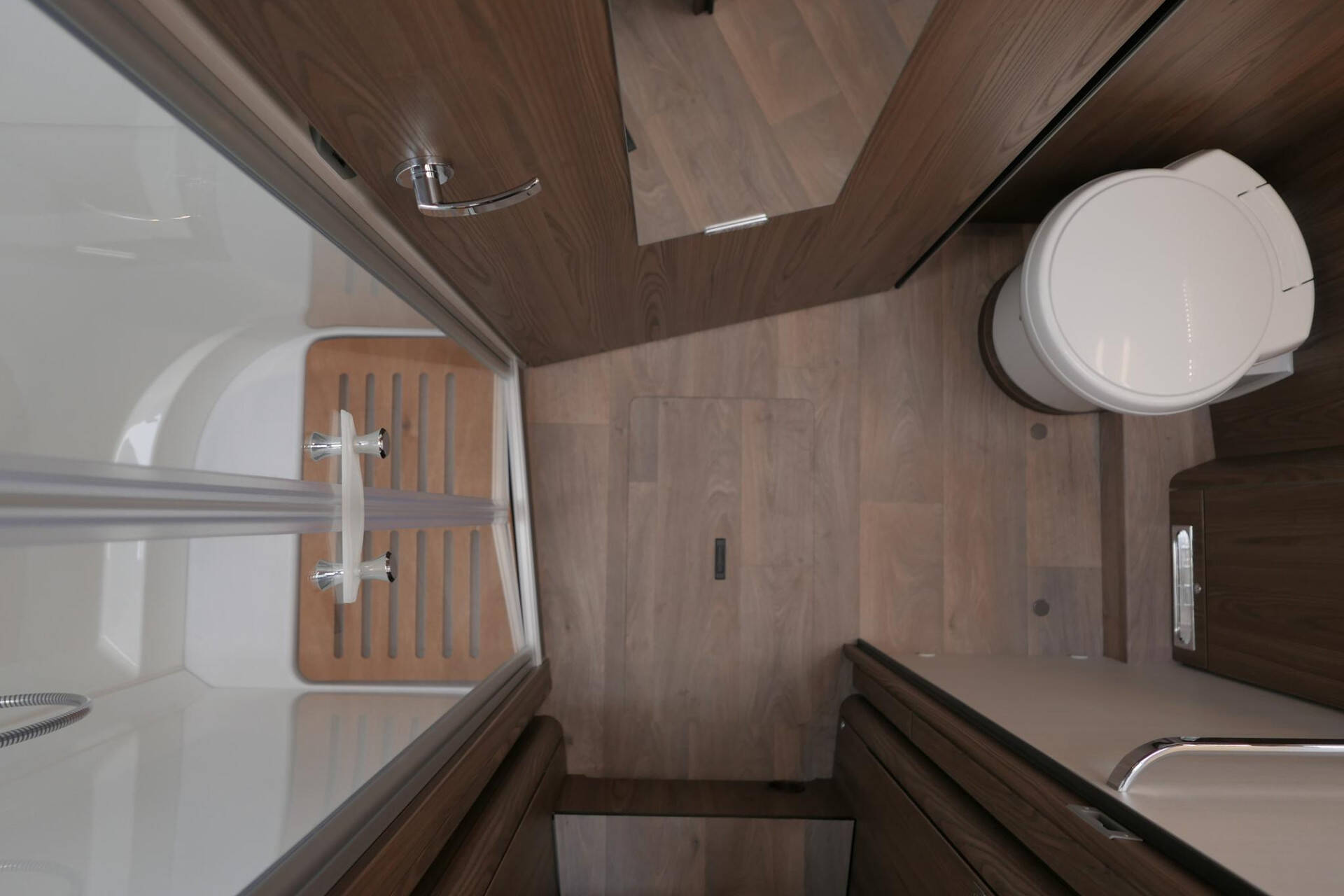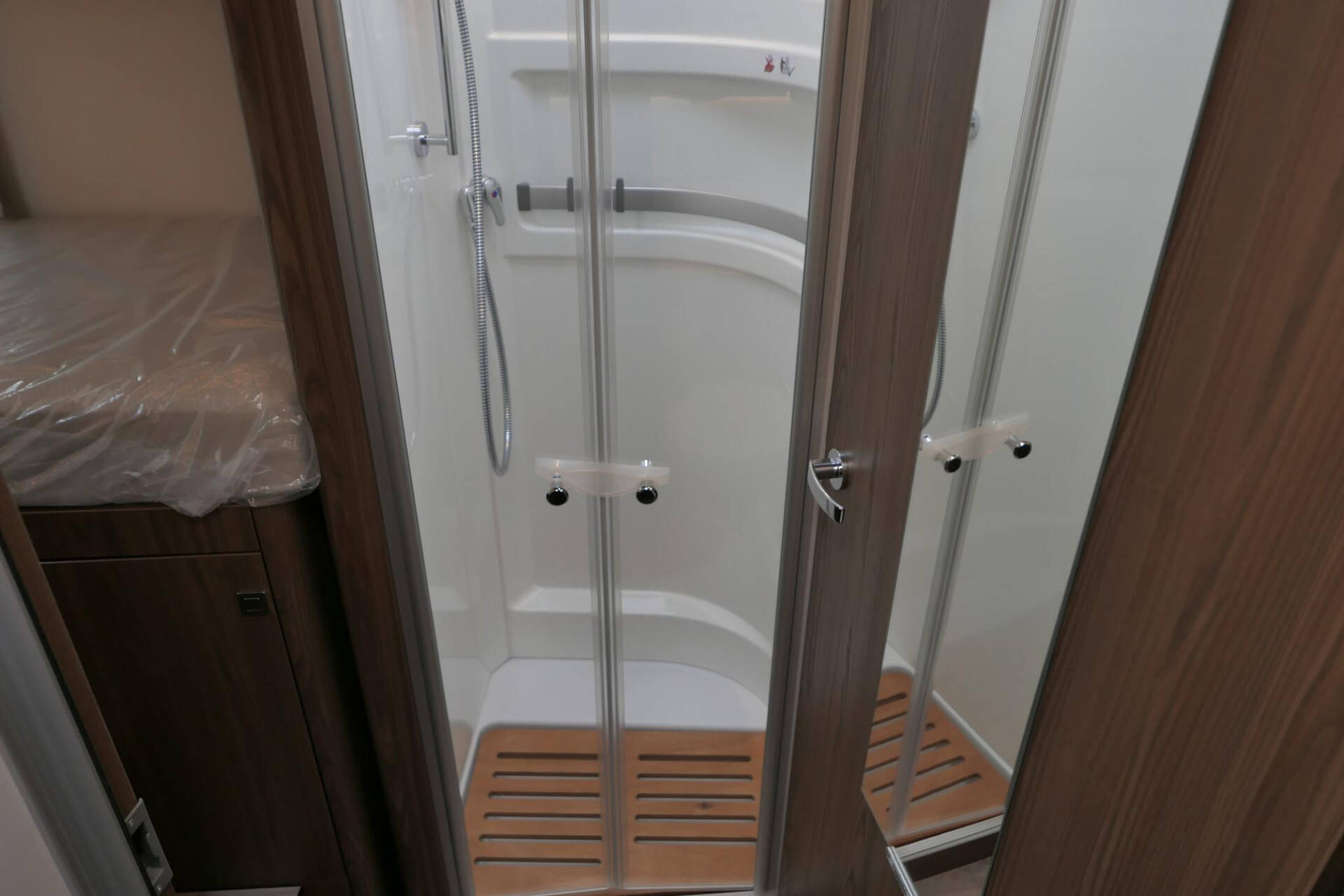Achterin bevinden zich de aparte douche en toilet en de enkele lengte bedden. Doormiddel van de tussendeur is deze ruimte af te sluiten van het woongedeelte voor extra privacy. De ruime toiletruimte is voorzien van toilet en wasbak, met daar tegenover de douchecabine. Onder de bedden is aan beide kanten extra kastruimte aanwezig.