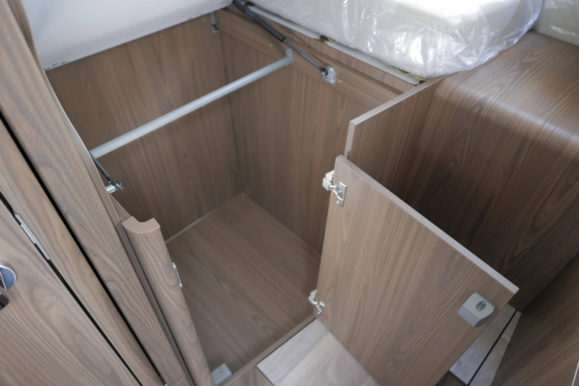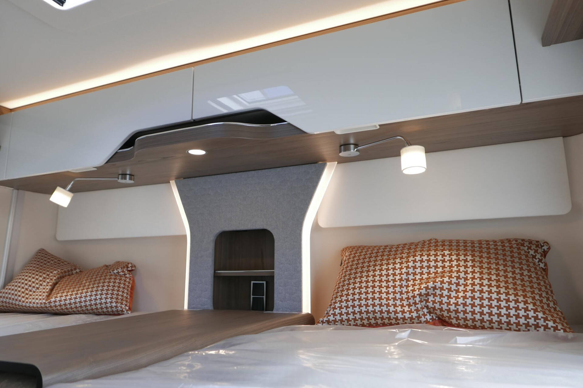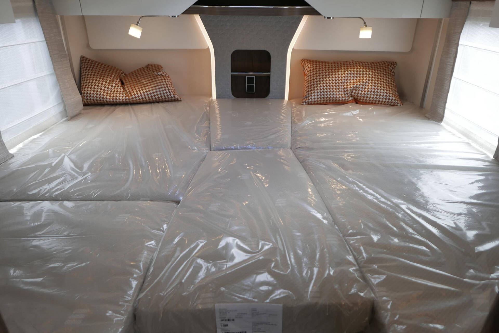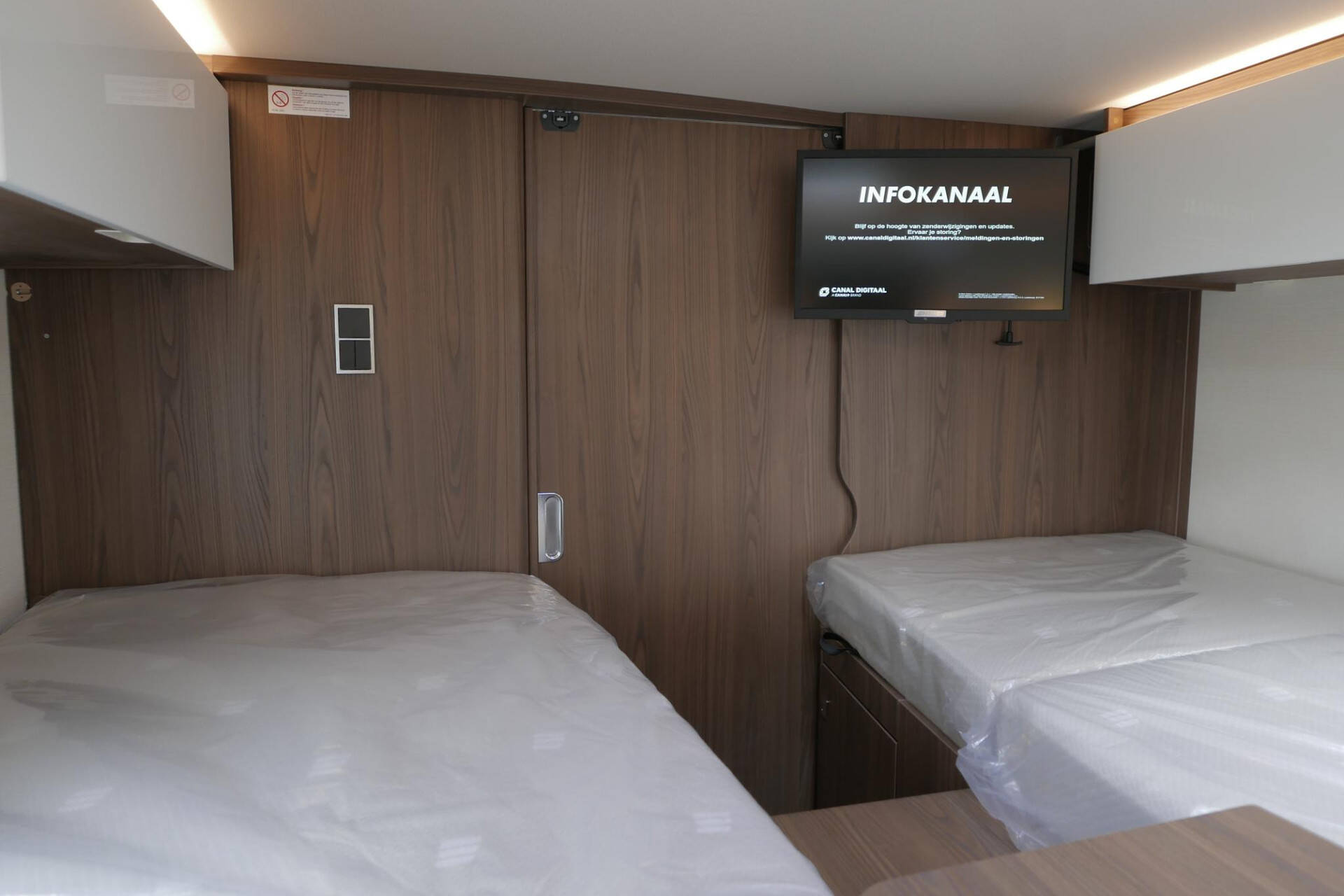 Achterin bevinden zich de aparte douche en toilet en de enkele lengte bedden. Doormiddel van de tussendeur is deze ruimte af te sluiten van het woongedeelte voor extra privacy. De ruime toiletruimte is voorzien van toilet en wasbak, met daar tegenover de douchecabine. Onder de bedden is aan beide kanten extra kastruimte aanwezig.