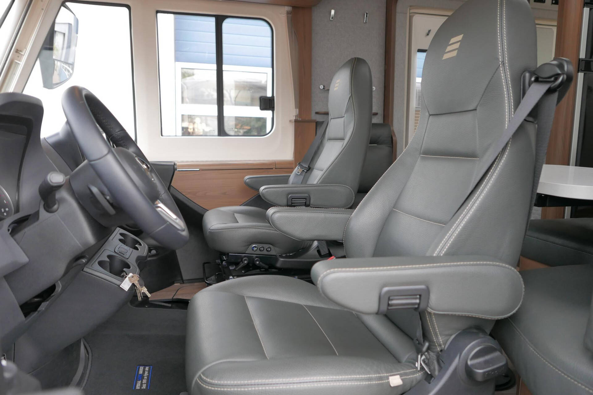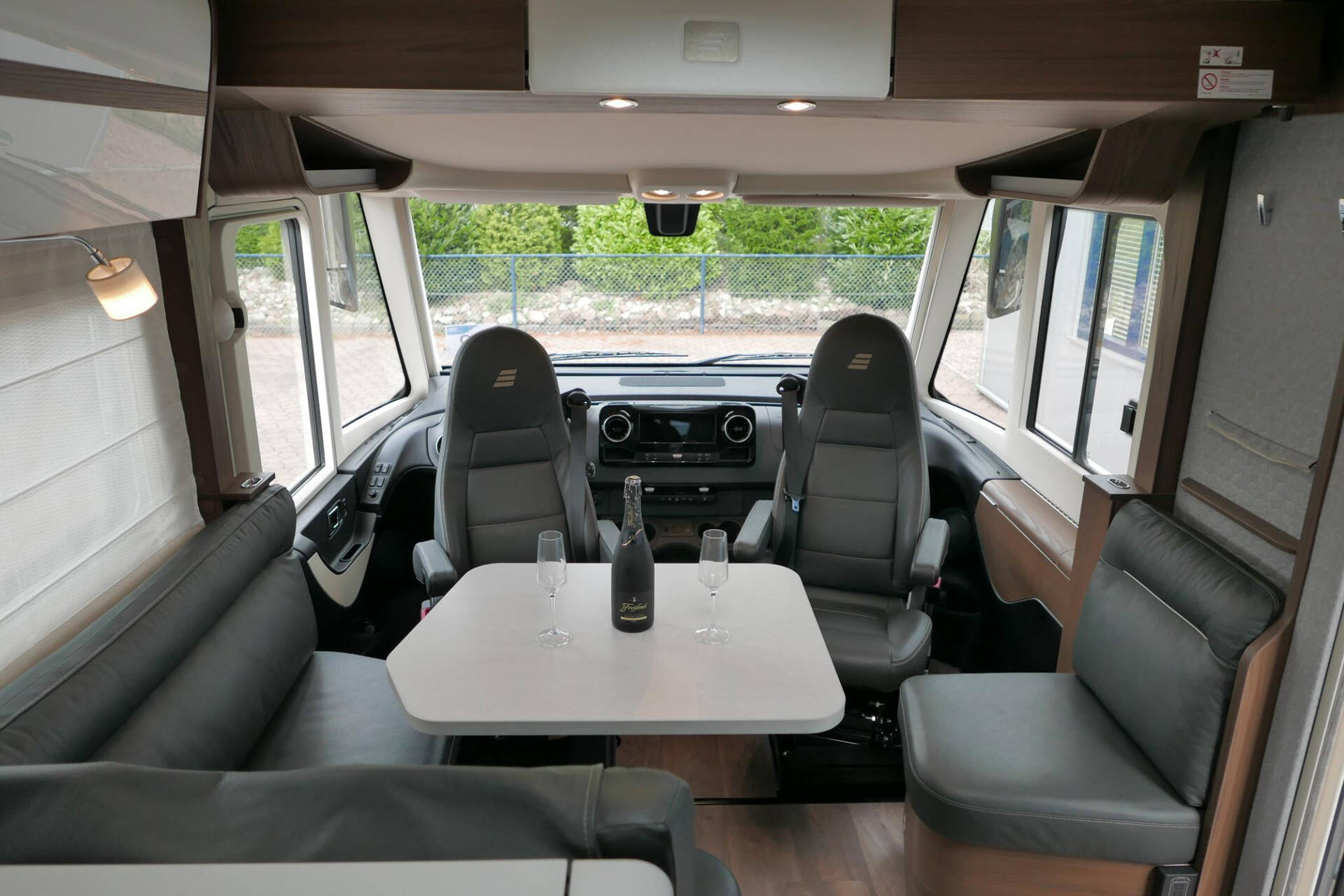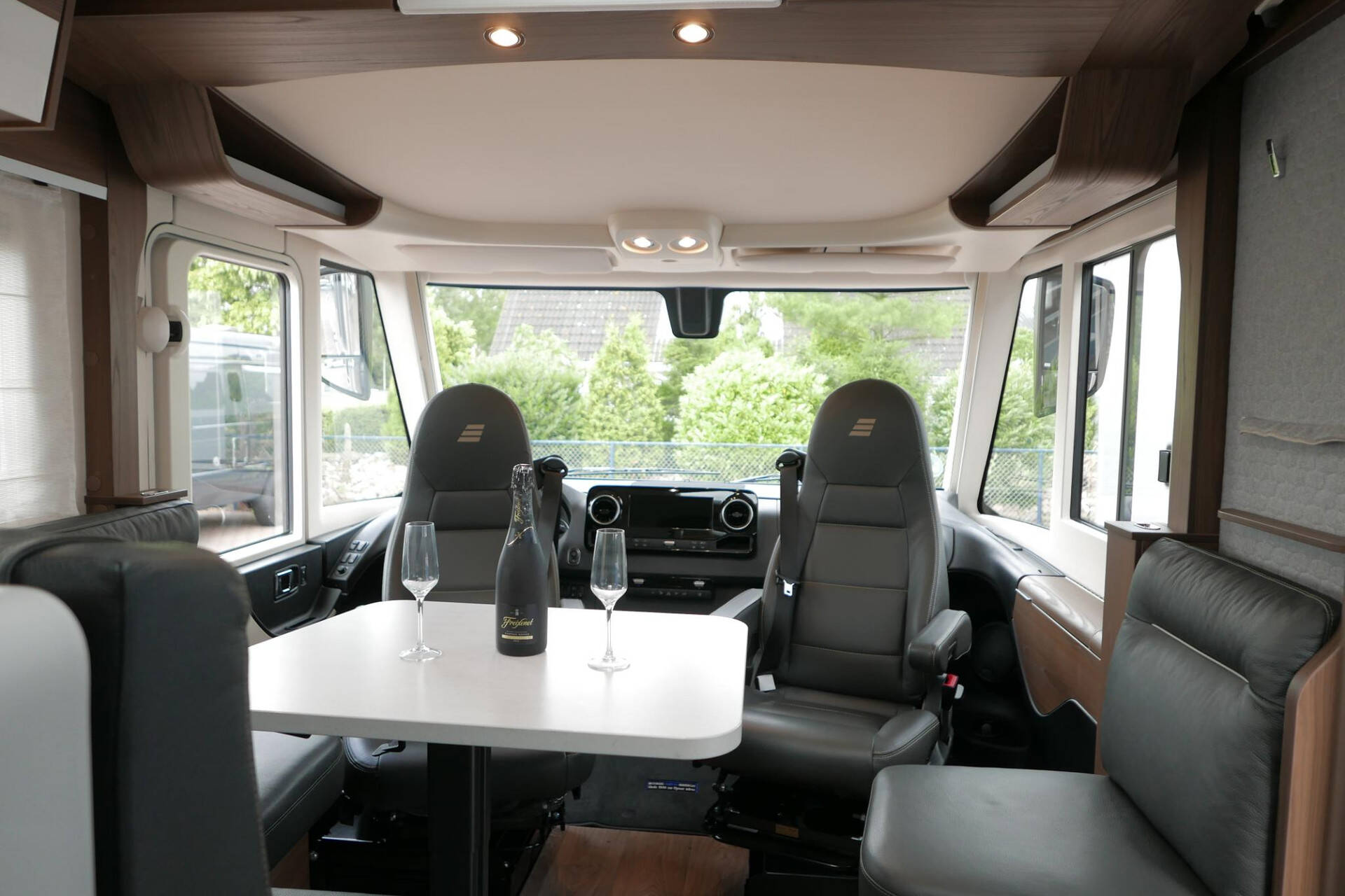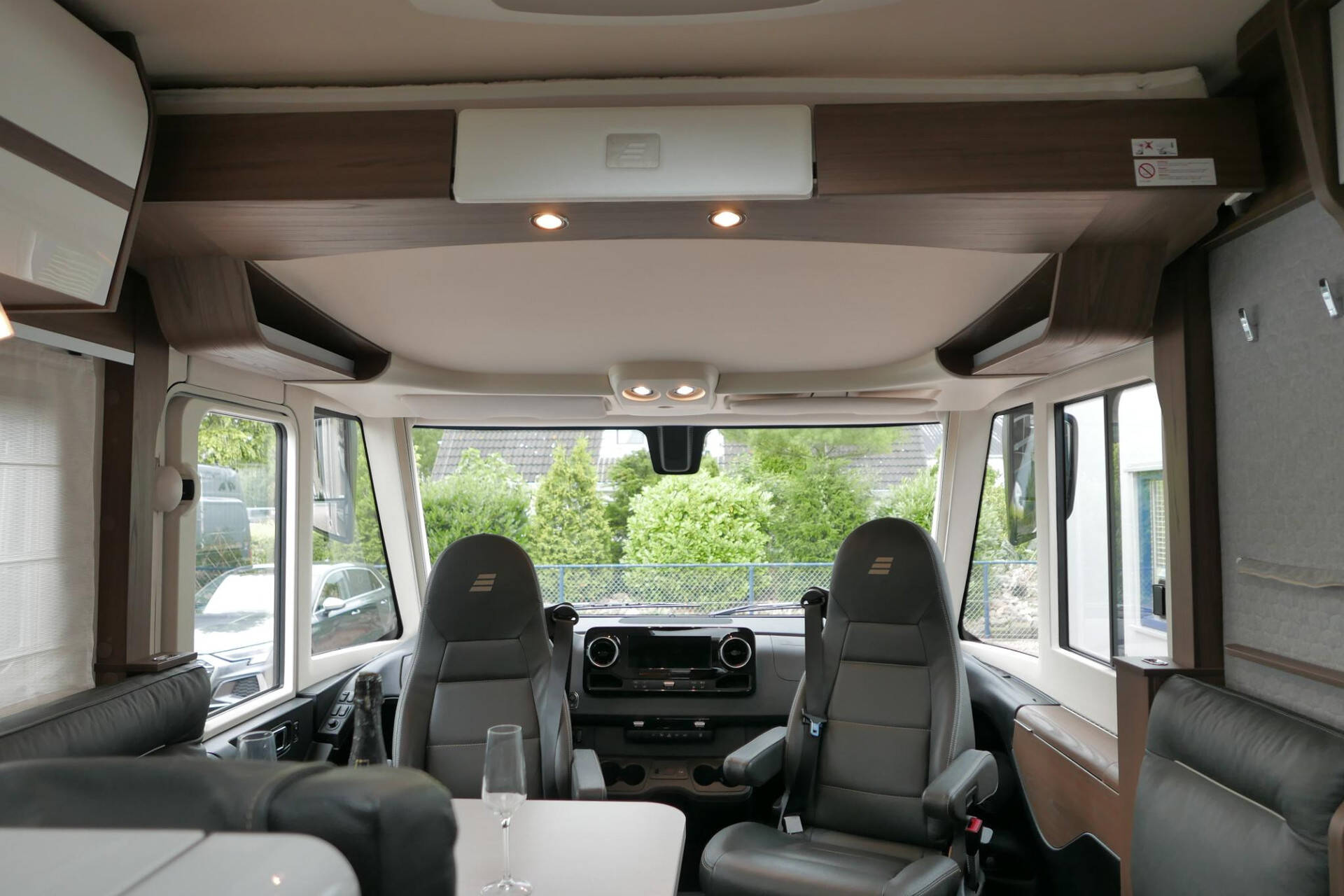 In de cabine van deze integraalcamper valt meteen het waanzinnige panorama uitzicht op, niet alleen om volop te genieten van de omgeving, maar ook voor een goed overzicht op het verkeer tijdens het rijden. De cockpit is voorzien van het Mercedes-Benz 10,25 inch MBUX multimediasysteem waarop onder andere de navigatie, de achteruitrijcamera en de DAB+ radio te bedienen zijn. De 2 comfortabele Aguti ergoflex stoelen zijn volledig verstelbaar en draaibaar. Verder beschikt deze camper over: