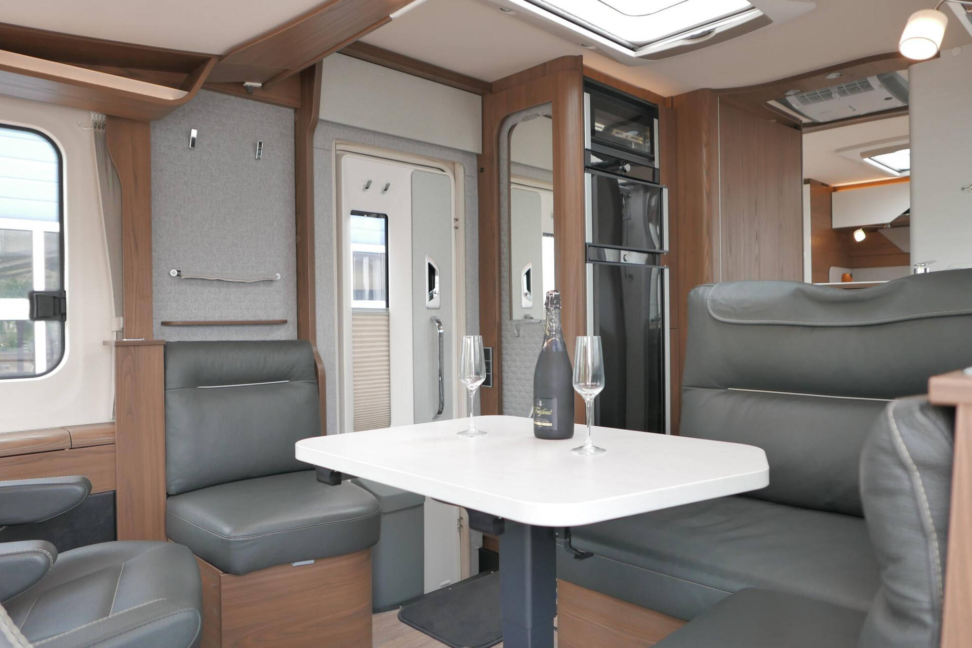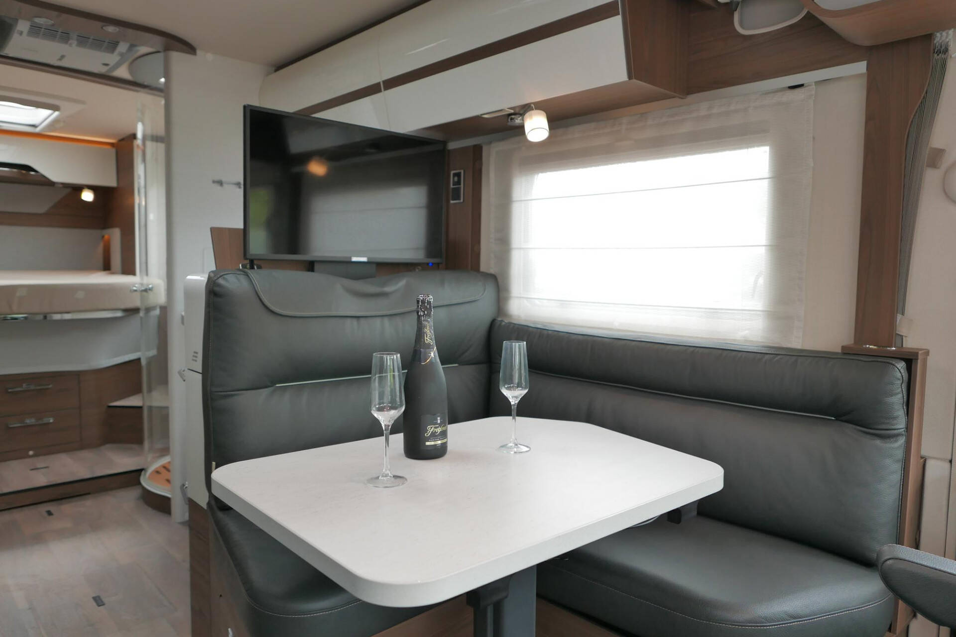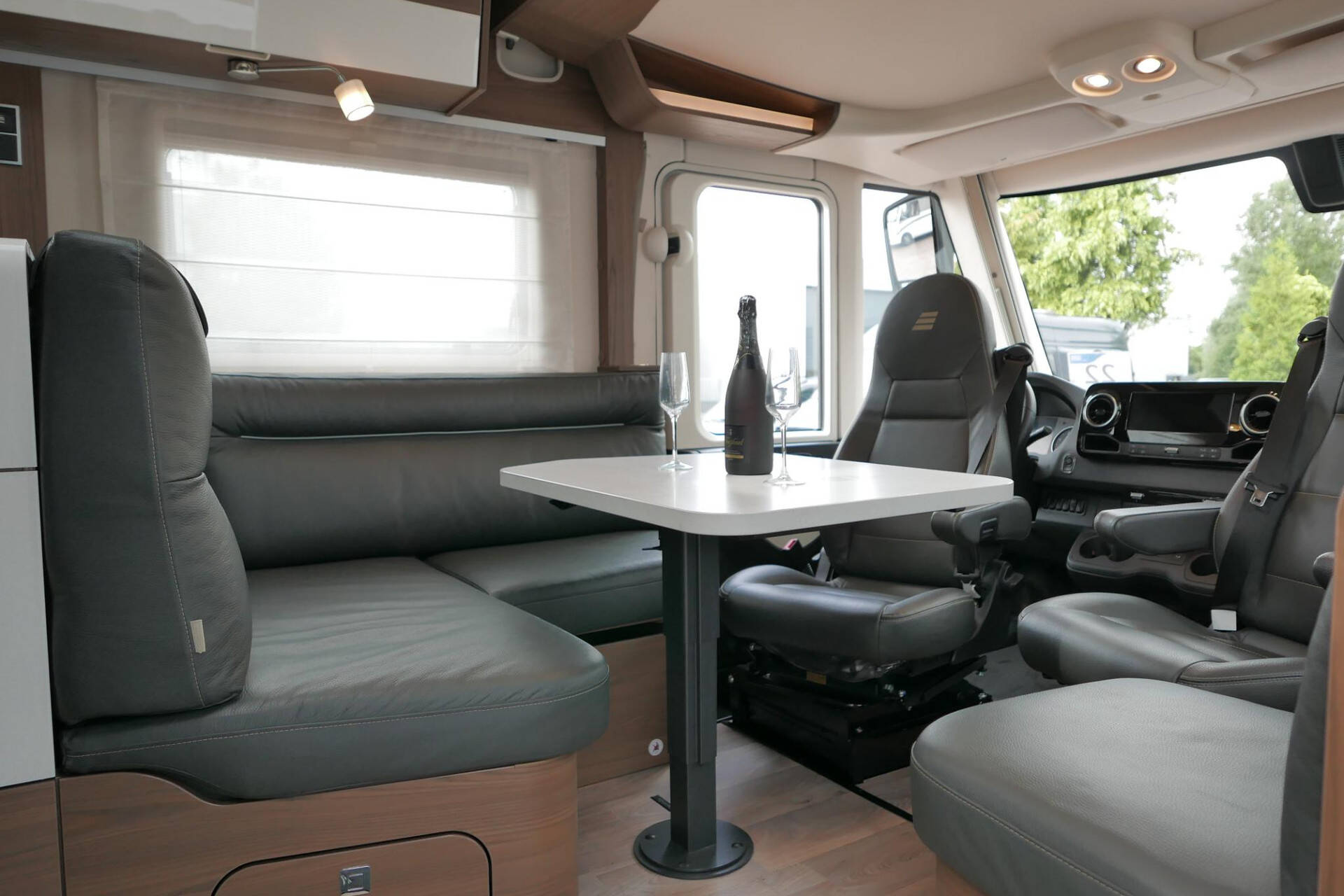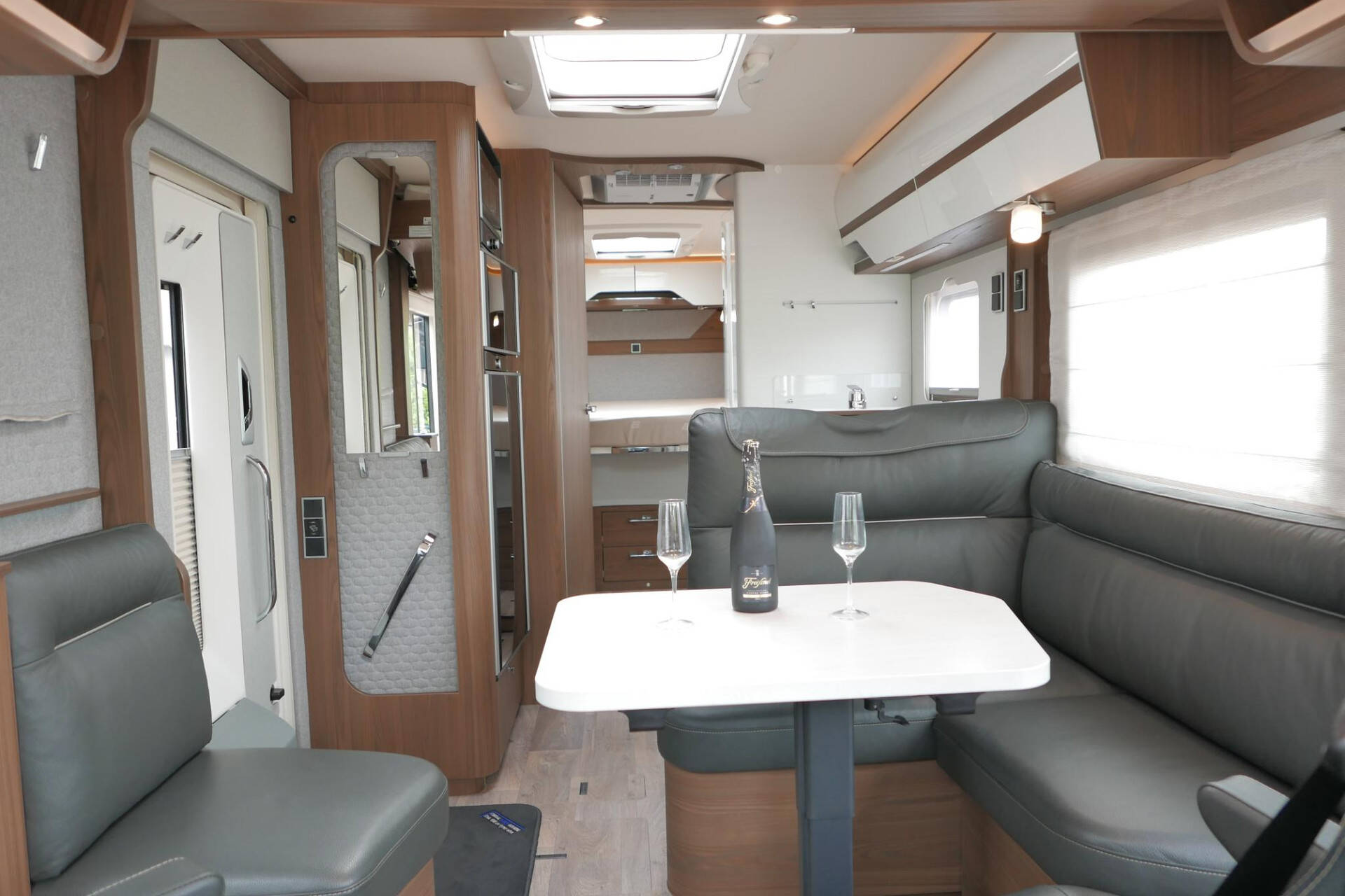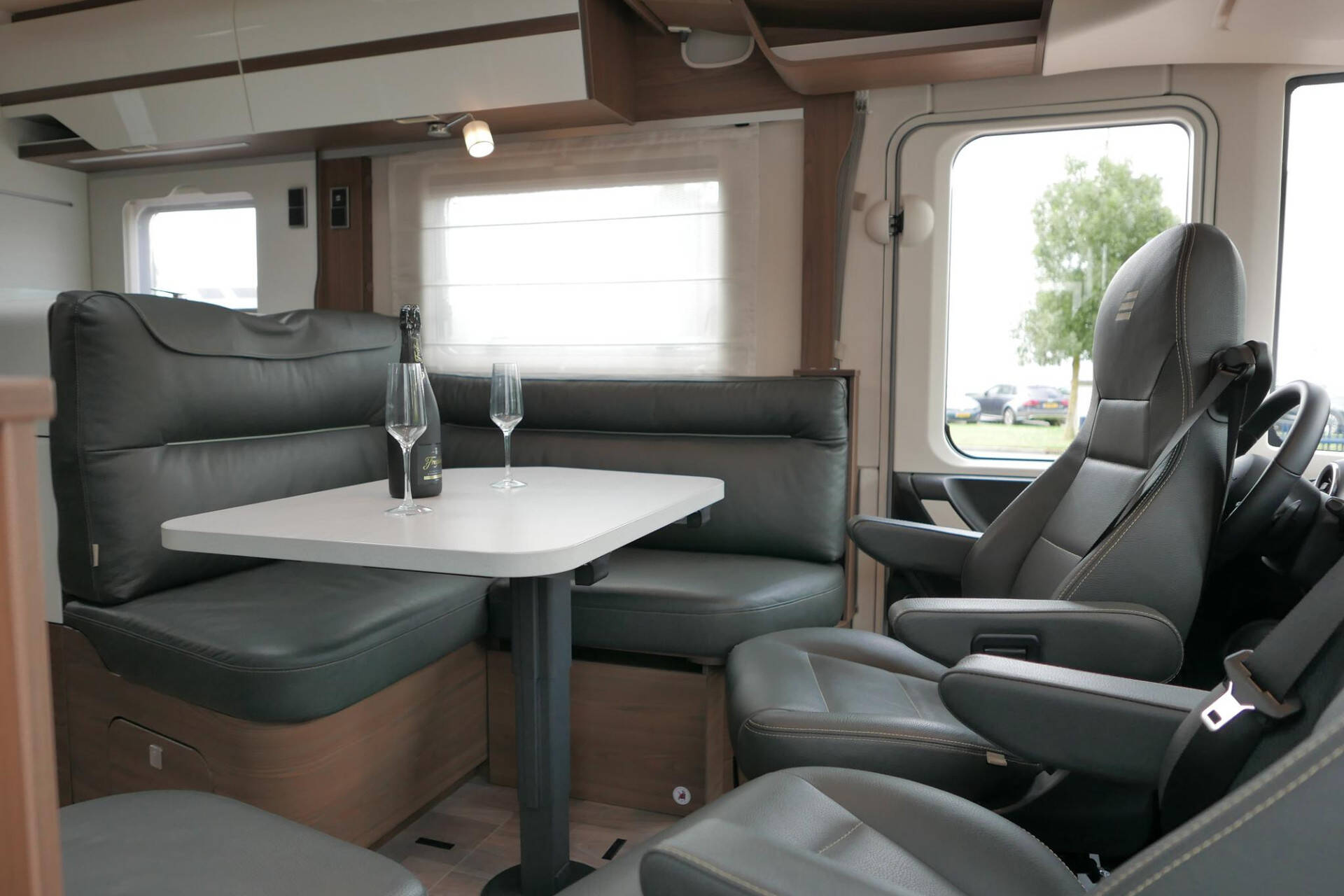 Door de voorstoelen te draaien ontstaat een royale zithoek met L-zit met een 360° draaibare tafel. Het Velvet Ash meubeldecor in combinatie met de luxe leder Grigio bekleding zorgen voor een chique uitstraling. Door het AL-KO chassis beschikt deze camper over een vlakke vloer met in de mee verwarmde dubbele bodem extra opbergruimte die zowel van binnenuit als van buitenaf te bereiken is. Ook de 180 liter schoon- 150 liter vuilwatertank bevinden zich in de dubbele bodem. Natuurlijk zijn alle ramen de toegangsdeur voorzien van horren en plisséverduistering.