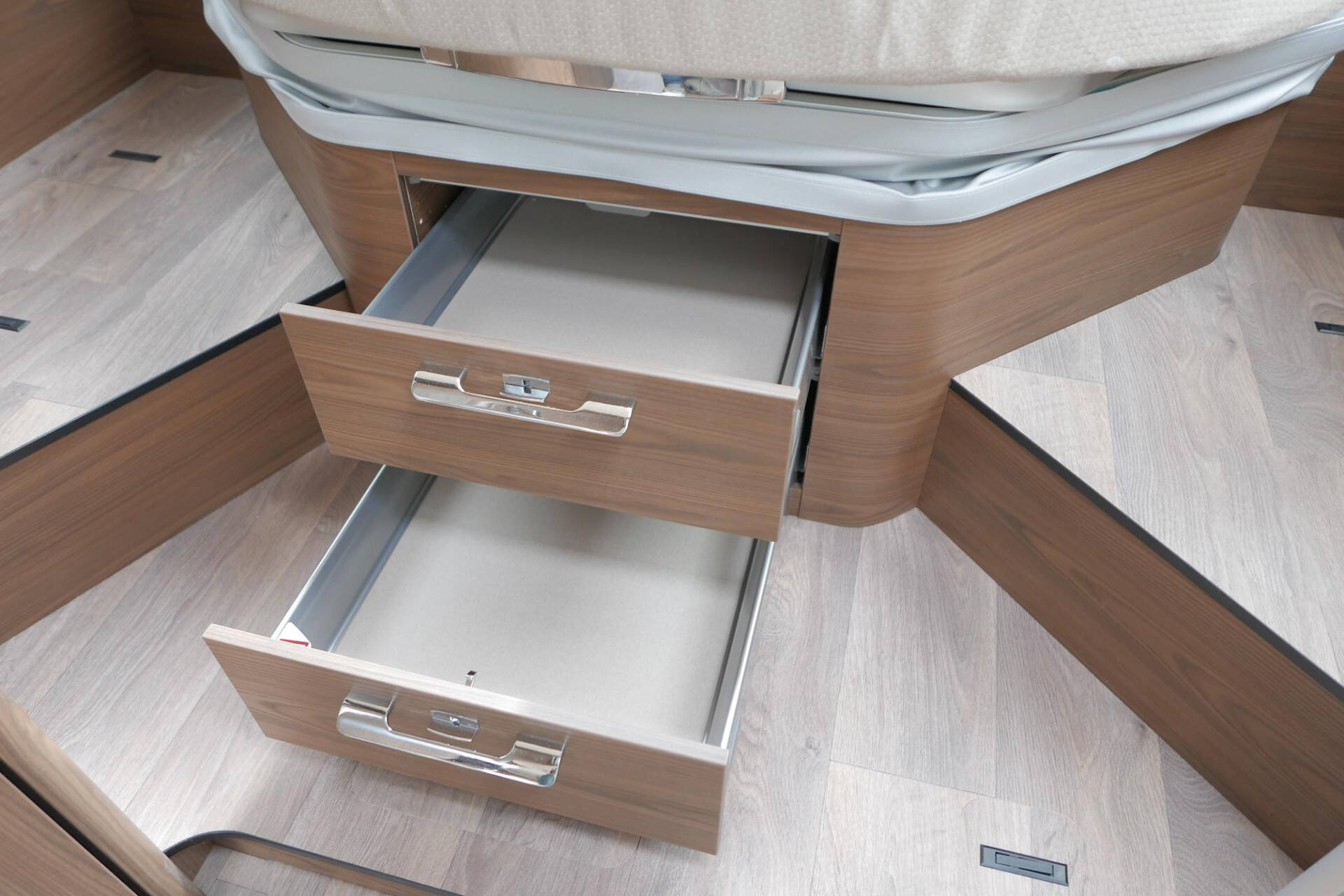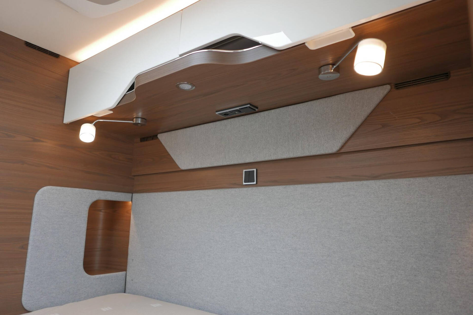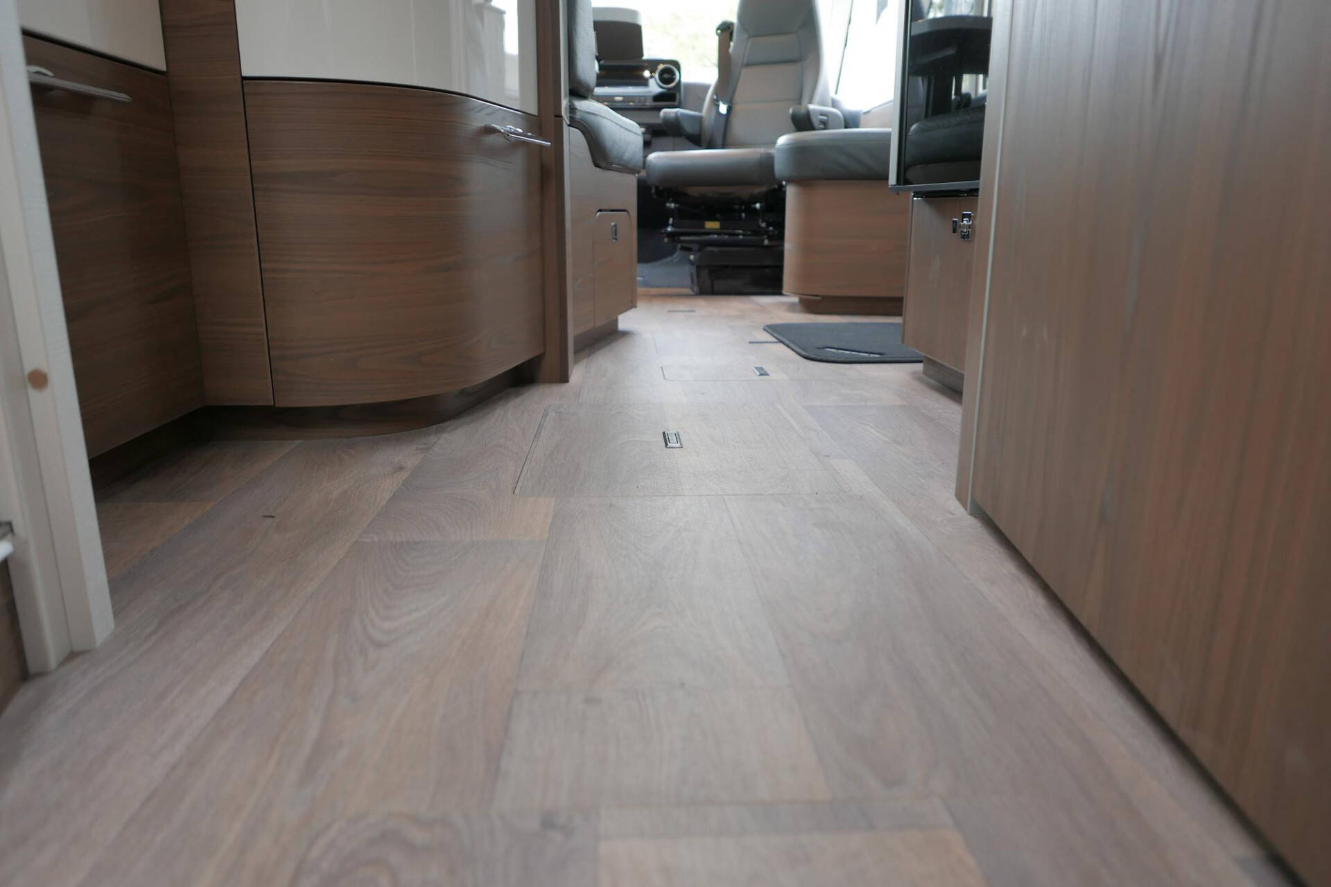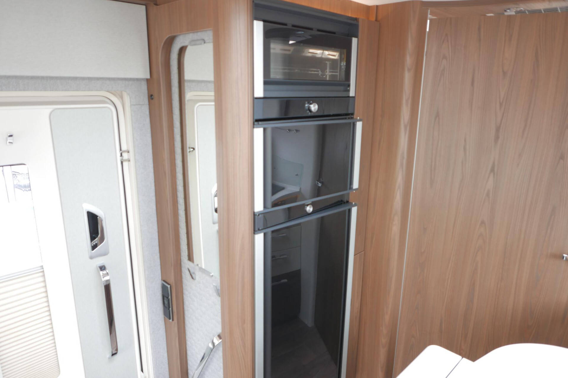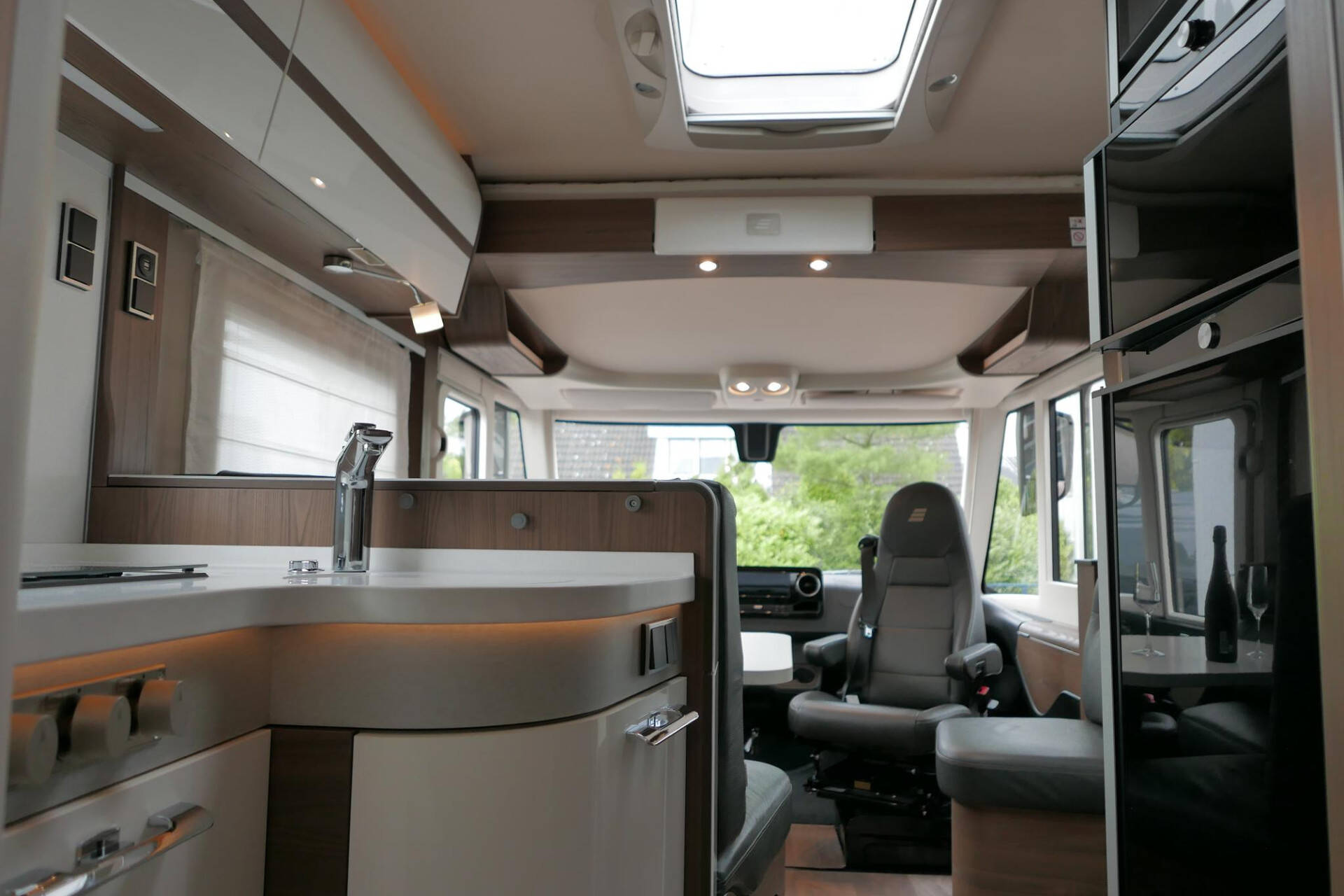 Door de voorstoelen te draaien ontstaat een royale zithoek met L-zit met een 360° draaibare tafel. Het Velvet Ash meubeldecor in combinatie met de luxe leder Grigio bekleding zorgen voor een chique uitstraling. Door het AL-KO chassis beschikt deze camper over een vlakke vloer met in de mee verwarmde dubbele bodem extra opbergruimte die zowel van binnenuit als van buitenaf te bereiken is. Ook de 180 liter schoon- 150 liter vuilwatertank bevinden zich in de dubbele bodem. Natuurlijk zijn alle ramen de toegangsdeur voorzien van horren en plisséverduistering.