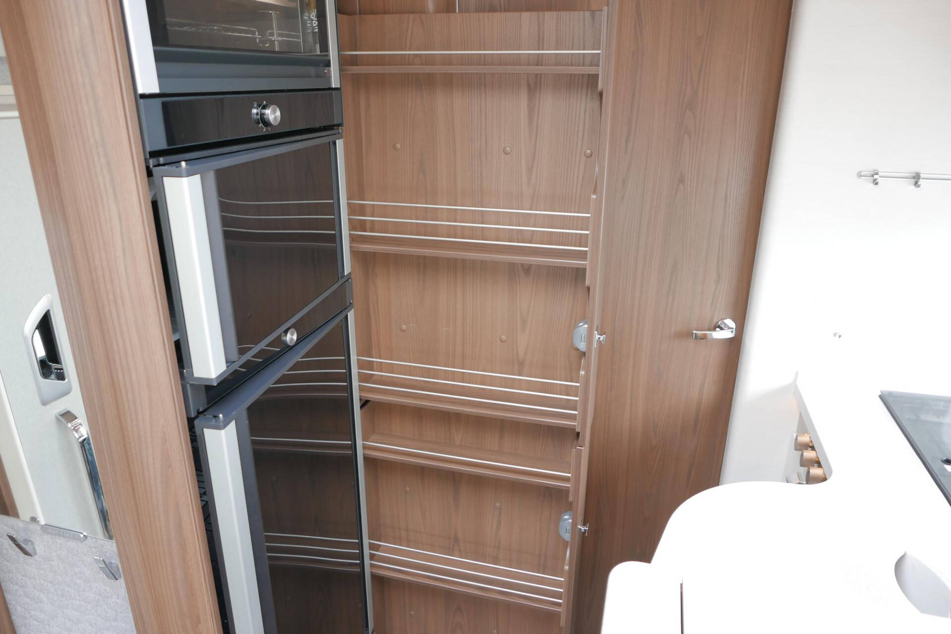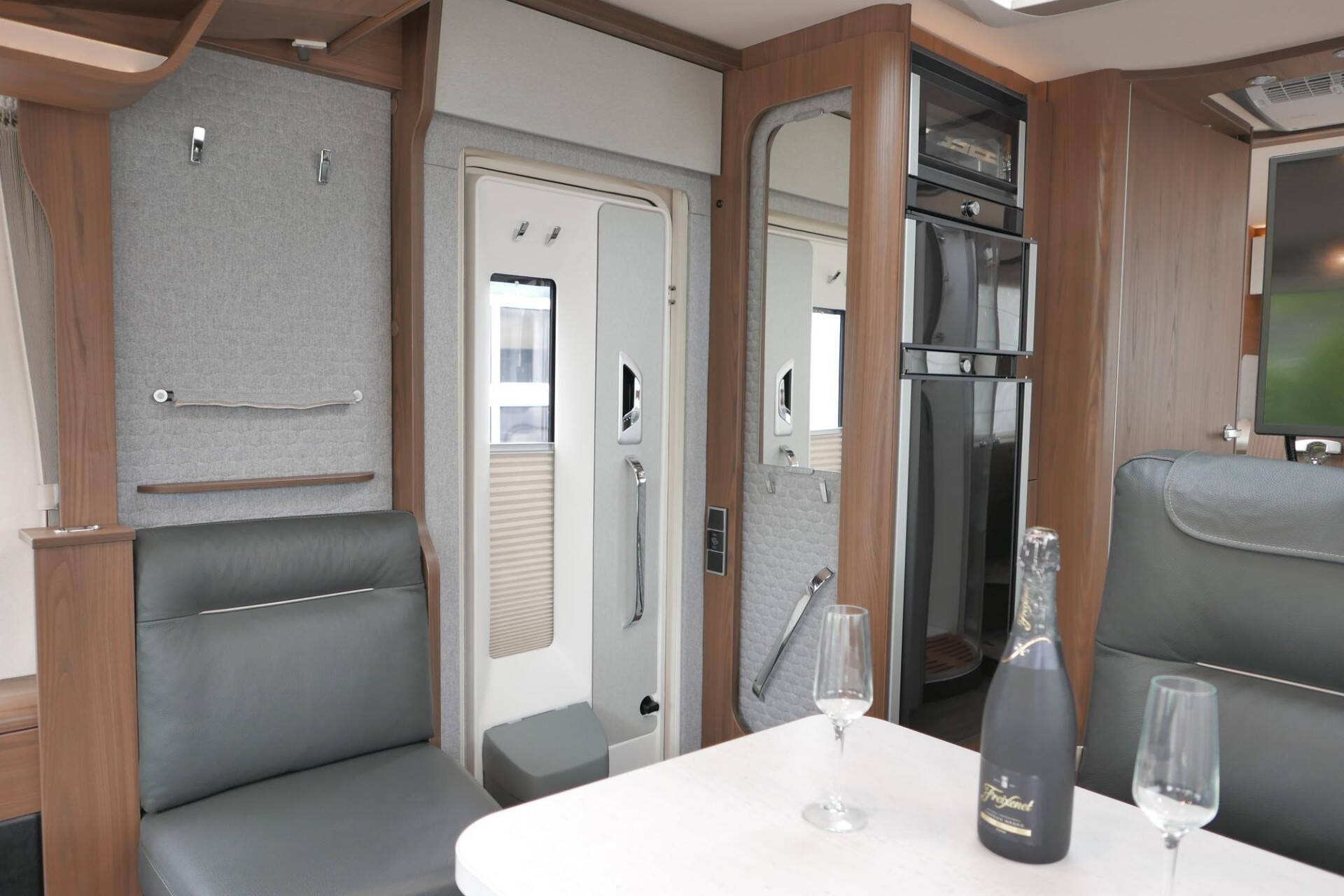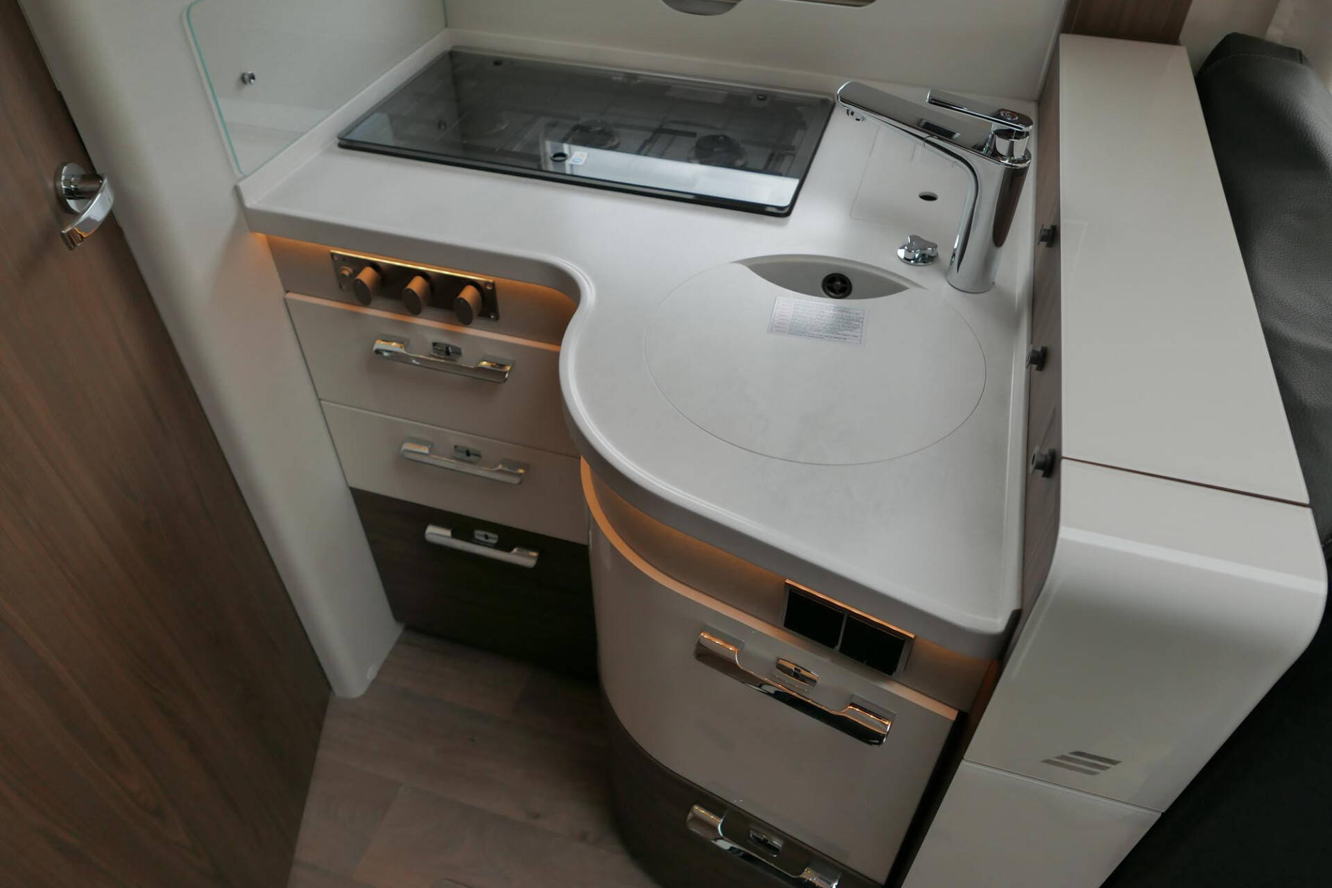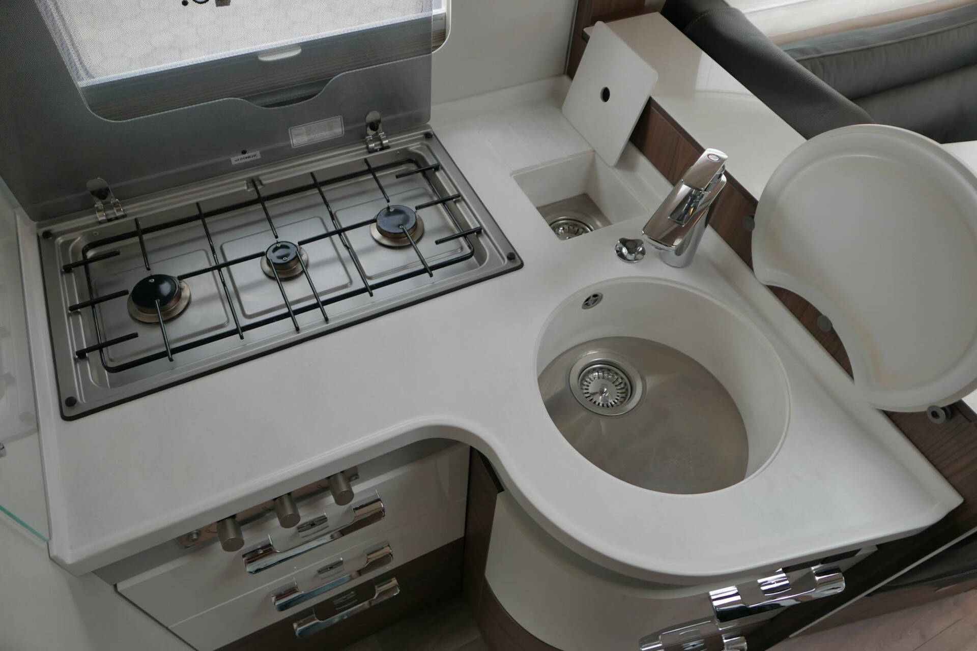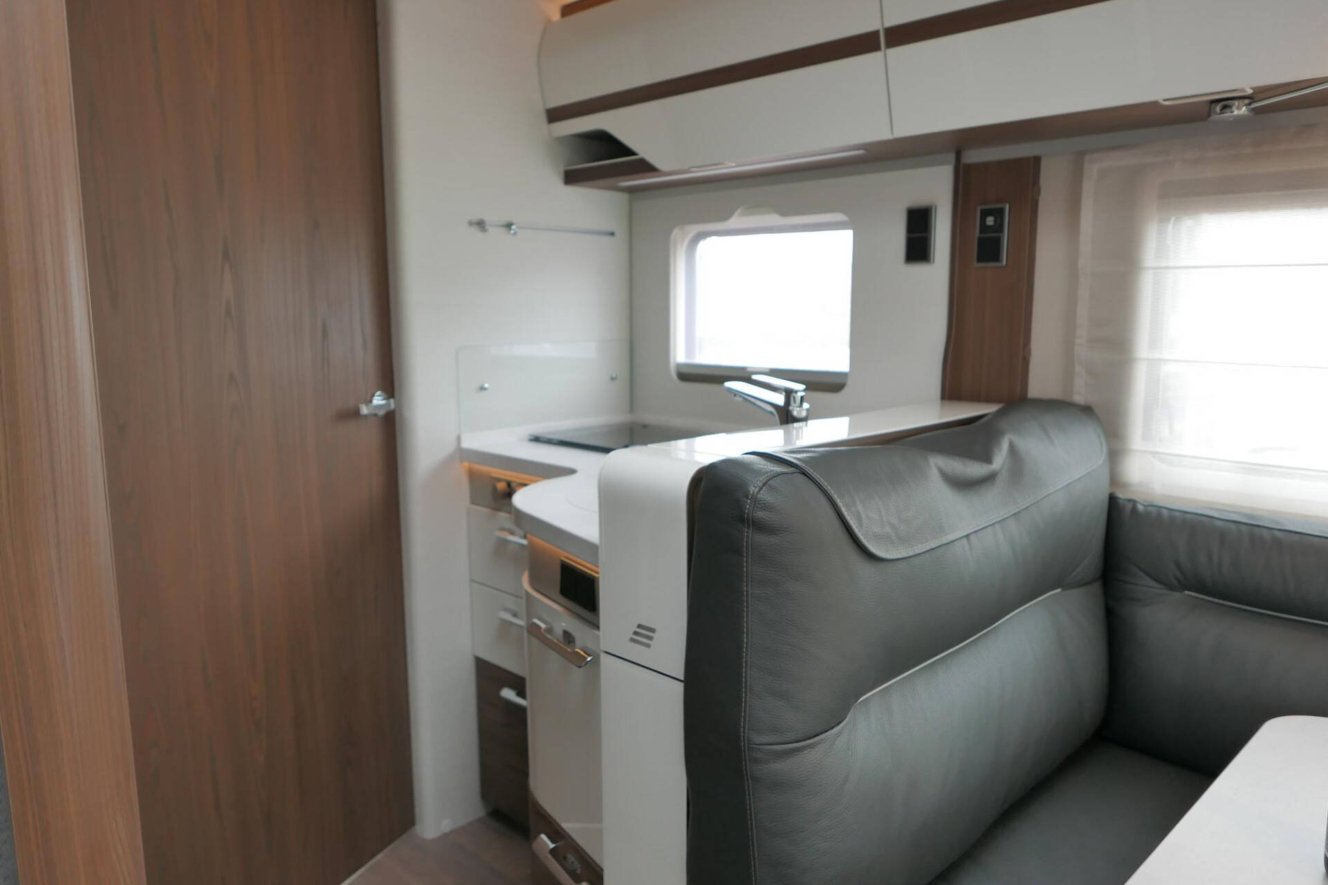 De luxe hoekkeuken is voorzien van diverse gelagerde boodschappenladen, waaronder een apothekerslade. Het keukenblad is van massief composiet en 3 pits gasstel. Hier tegenover bevindt zich de grote TecTower koelkast met aparte vriezer en automatische omschakeling 230V/12V/gas. De deuren zijn zowel links als rechts scharnieren, zodat u vanuit de keuken én vanuit de woonruimte makkelijk in de koelkast kunt.