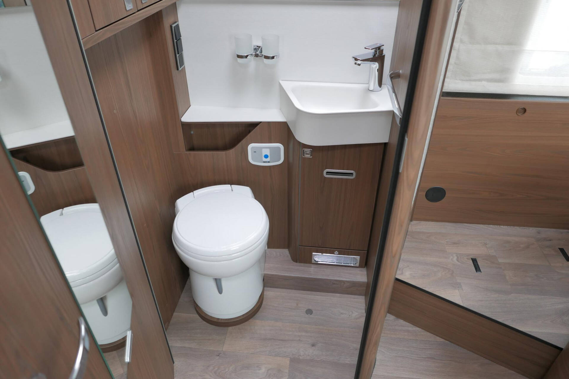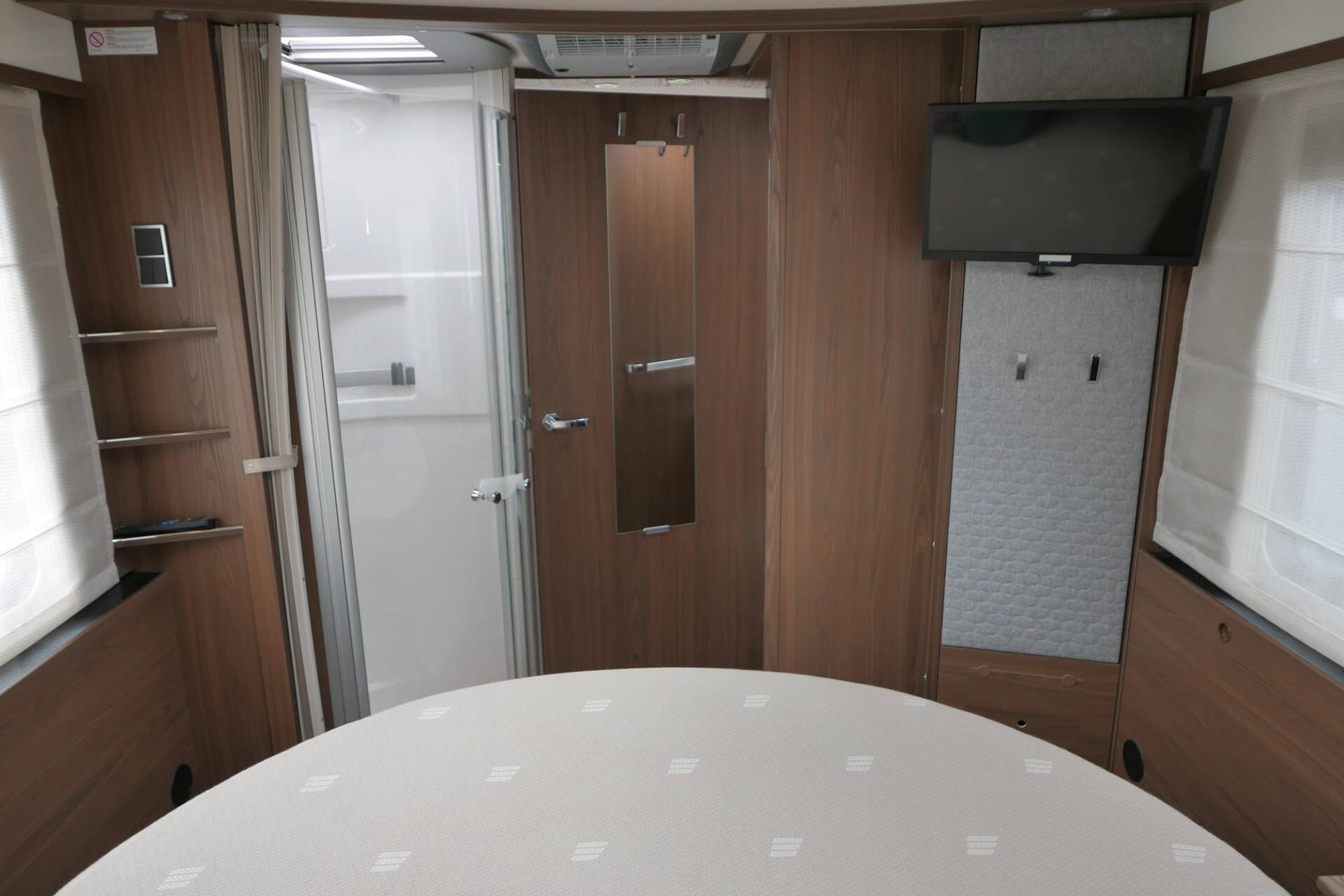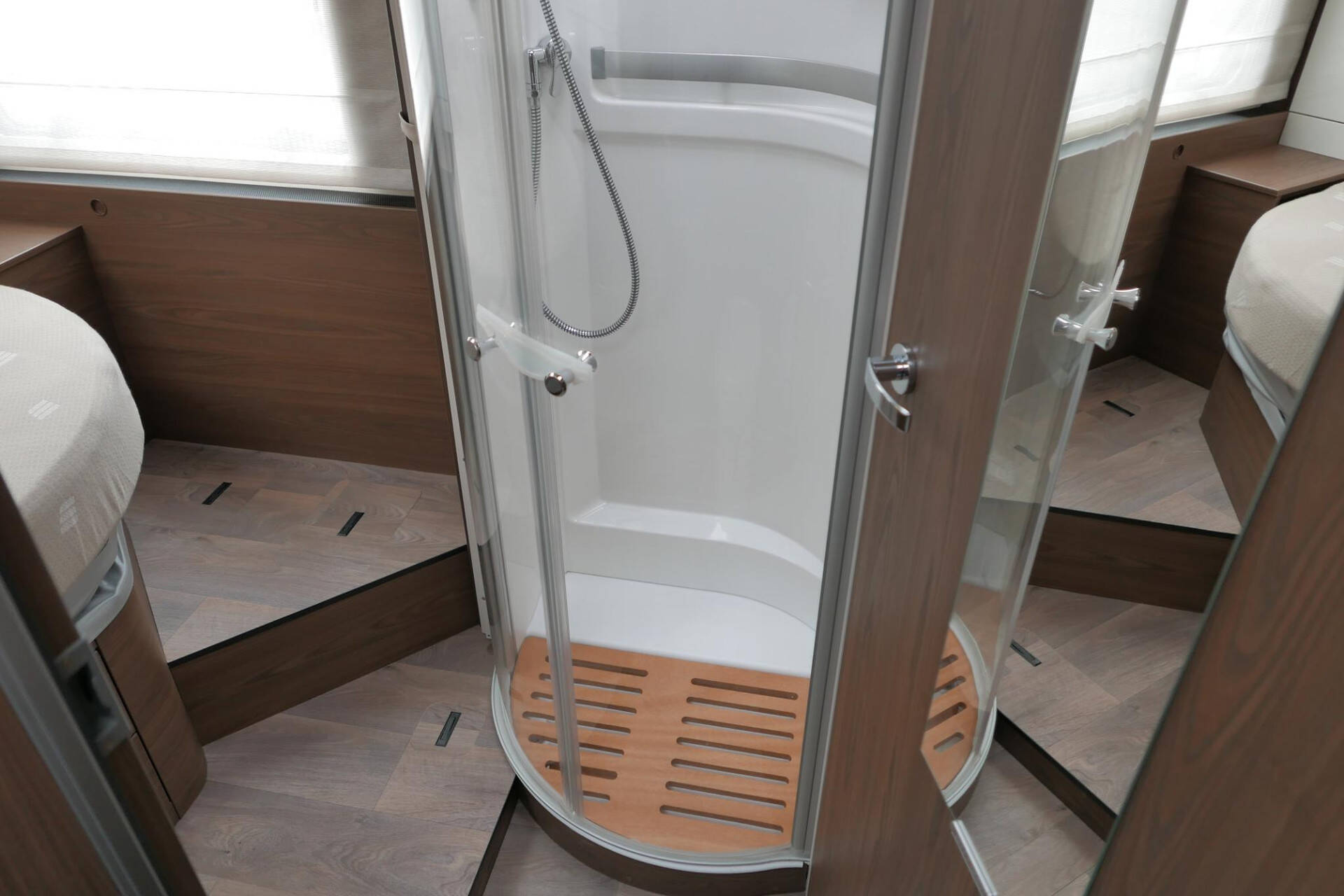 Achterin bevinden zich de aparte douche en toilet en royale queensbed 200 x 156 cm. Doormiddel van de tussendeur is deze ruimte af te sluiten van het woongedeelte voor extra privacy. De ruime toiletruimte is voorzien van toilet en wasbak, met daar tegenover de aparte douchecabine. Naast en onder het bed is extra (hang)kastruimte aanwezig.