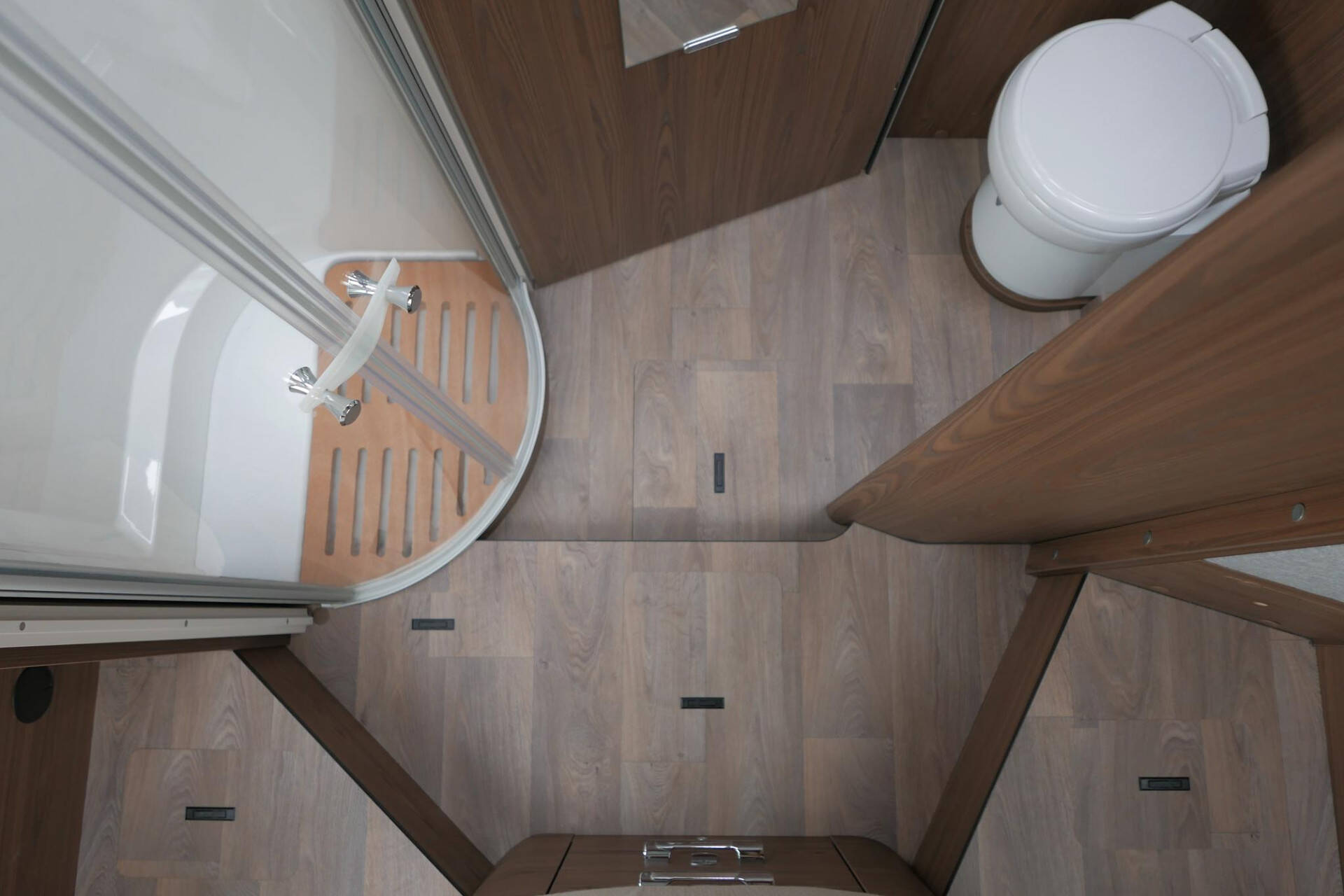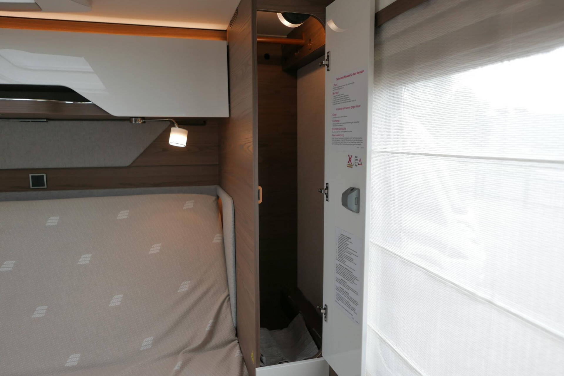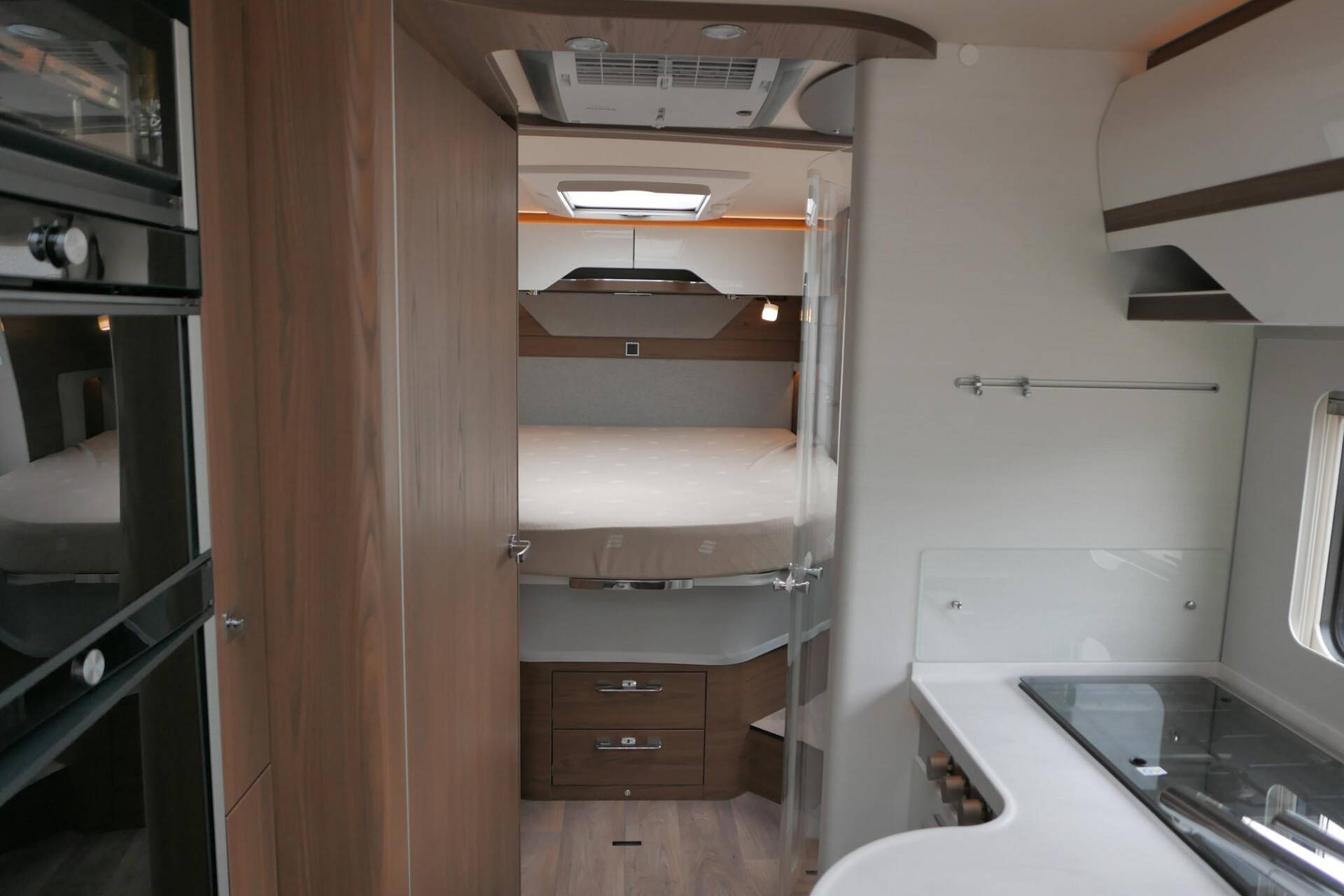 Achterin bevinden zich de aparte douche en toilet en royale queensbed 200 x 156 cm. Doormiddel van de tussendeur is deze ruimte af te sluiten van het woongedeelte voor extra privacy. De ruime toiletruimte is voorzien van toilet en wasbak, met daar tegenover de aparte douchecabine. Naast en onder het bed is extra (hang)kastruimte aanwezig.