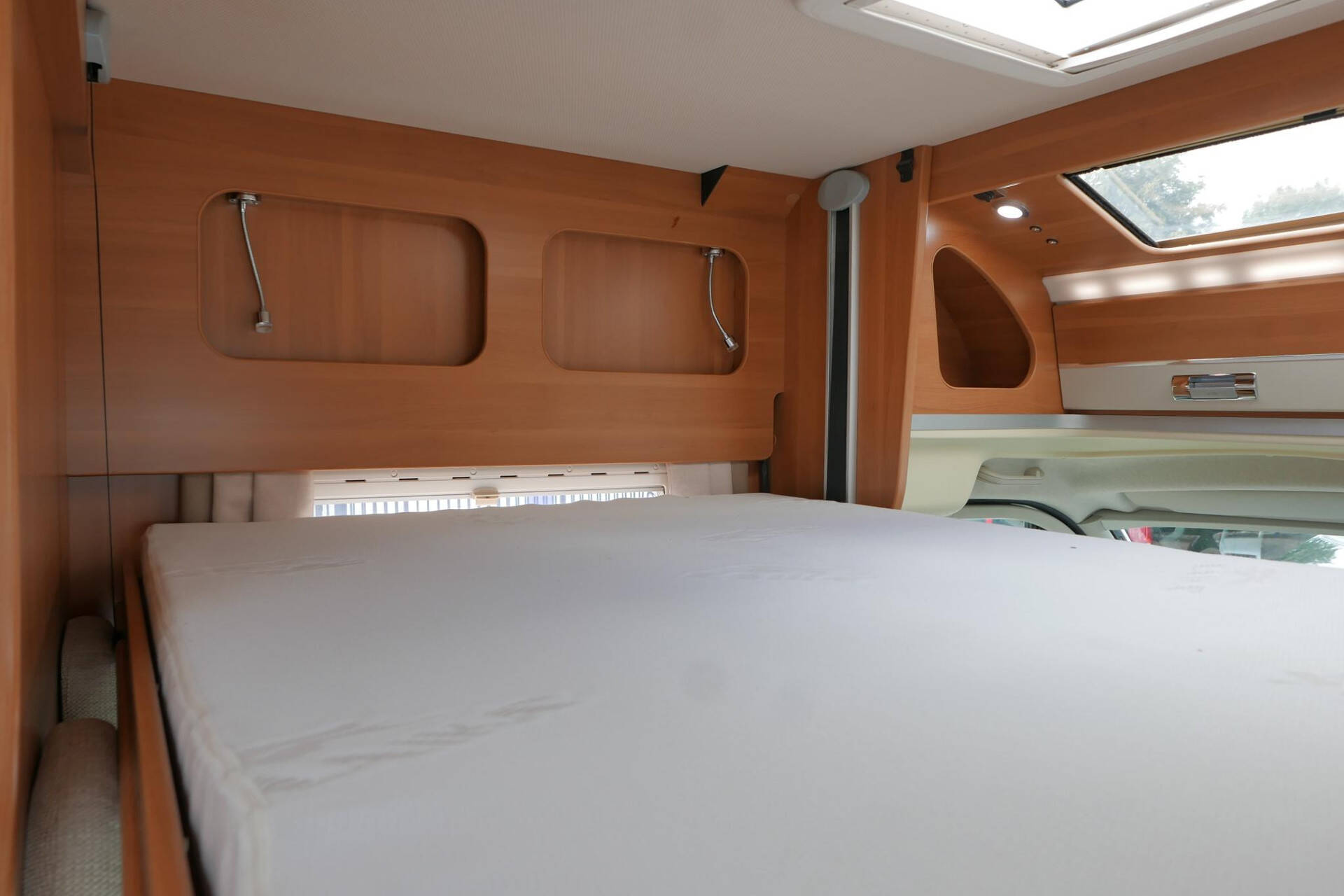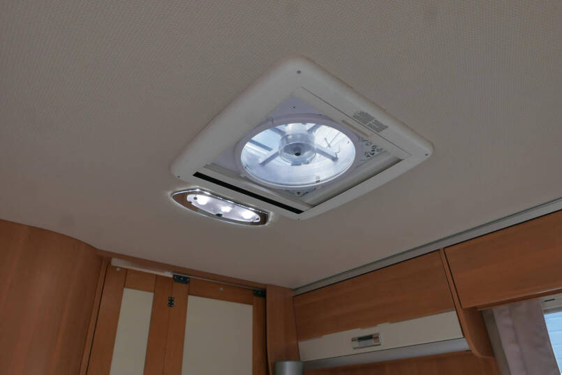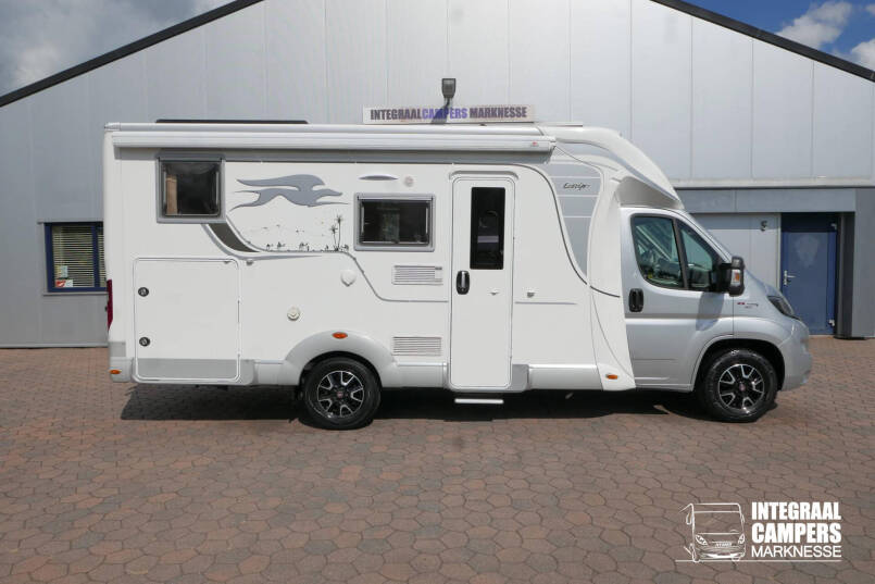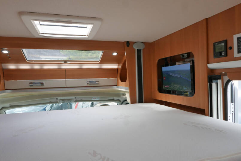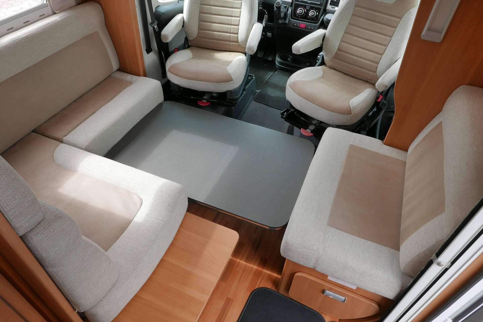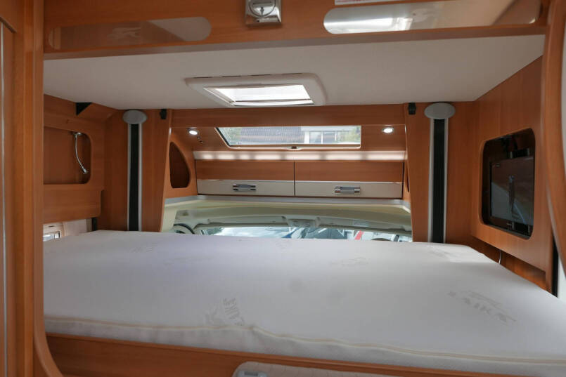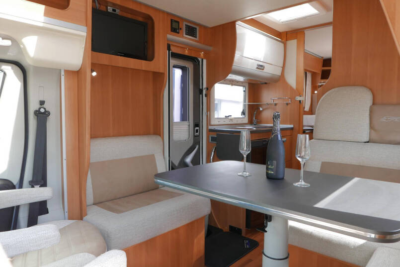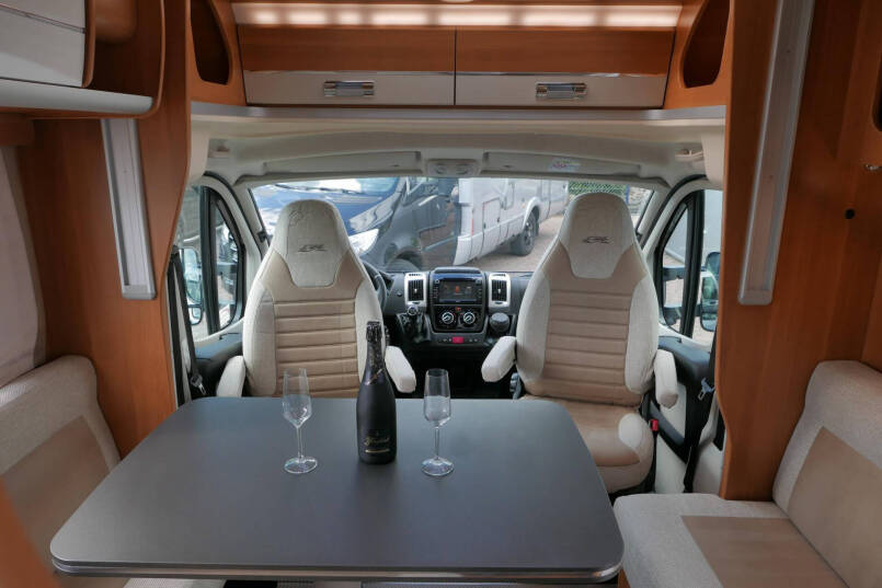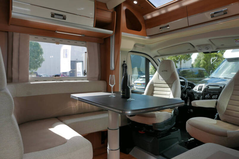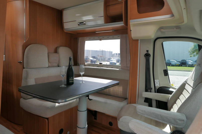 Wanneer u de voorstoelen draait, ontstaat een ruime zithoek. De tafel is te verschuiven en te laten zakken, zodat de ruimte optimaal wordt benut en als extra slaapplaats te gebruiken is. Tevens is deze half integraal uit gerust met een elektrische bedienbaar hefbed voor nog een extra slaapplaats. Het lichte interieur met de witte klepkastjes in combinatie met mooie lichte bekleding geven deze camper een frisse uitstraling. Uiteraard zijn de ramen en toegangsdeur voorzien van horren en verduistering.