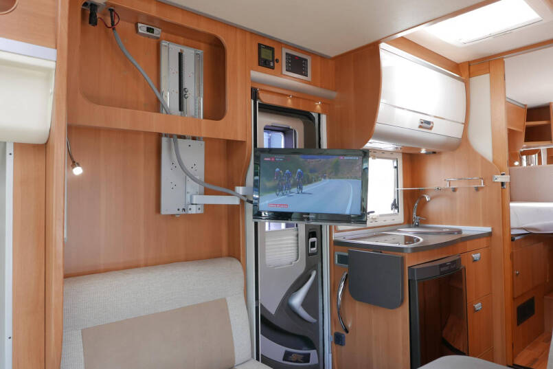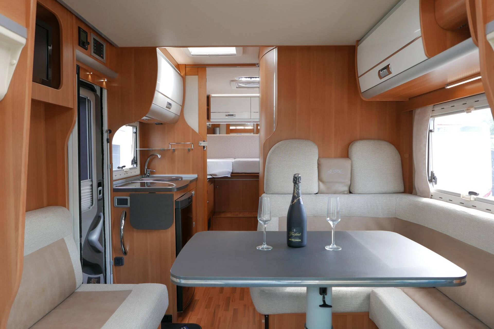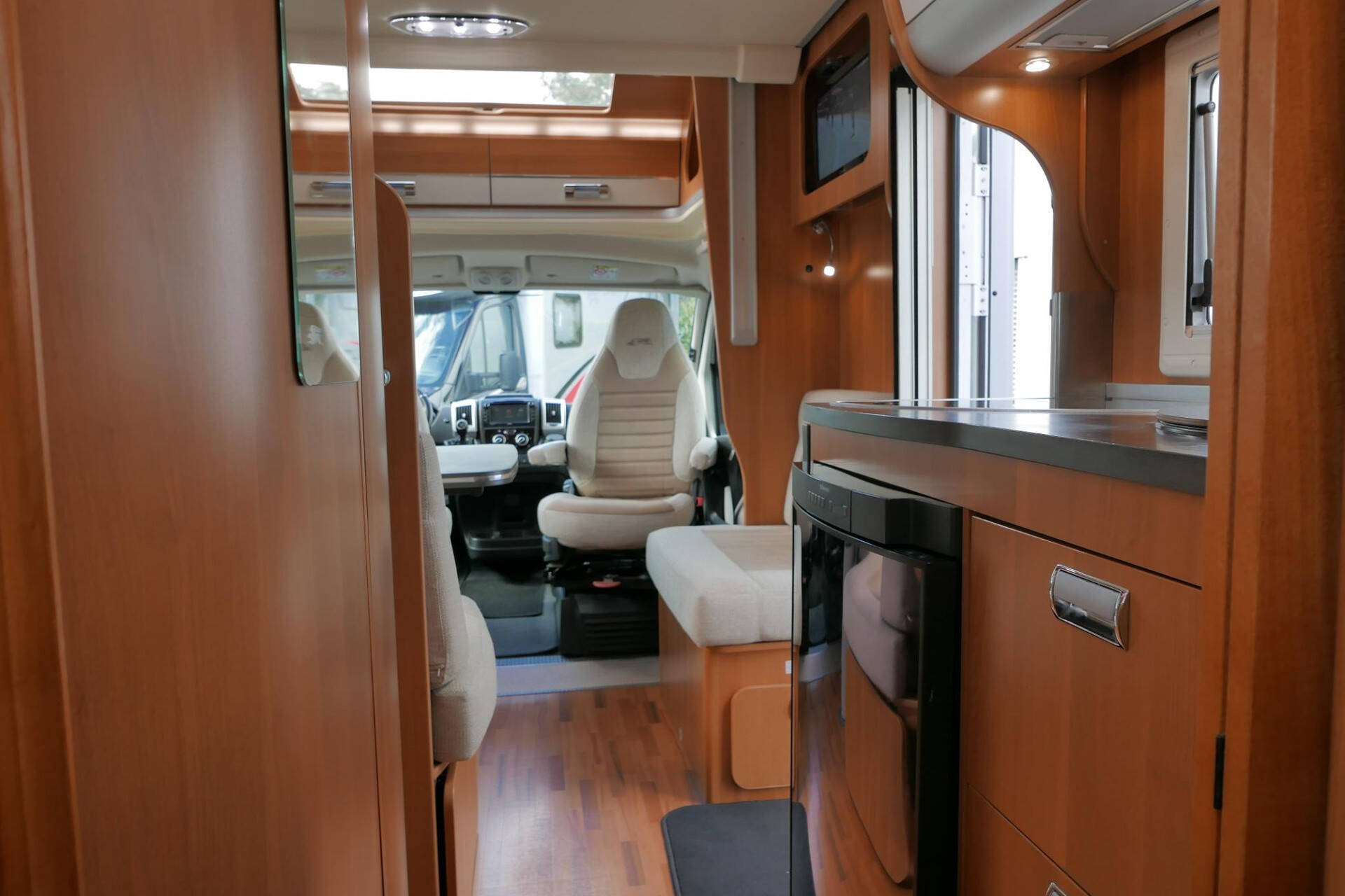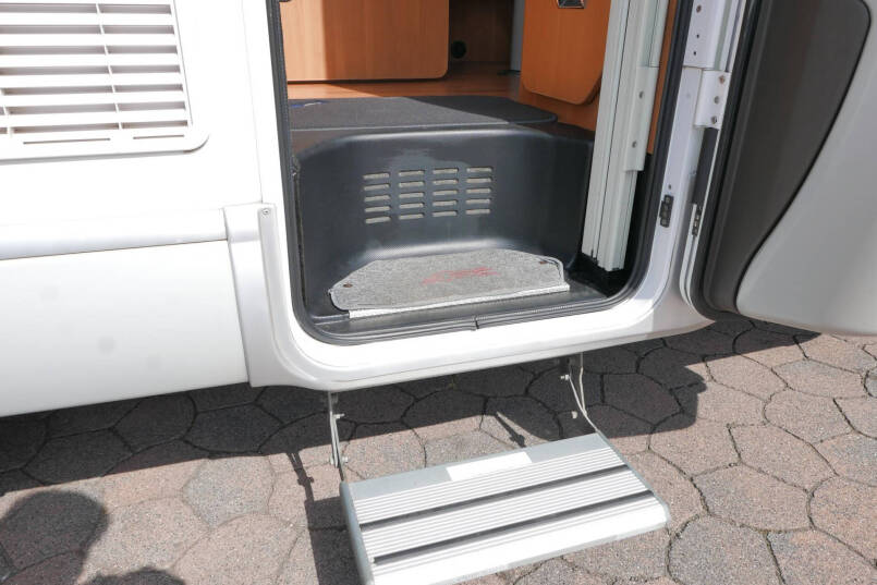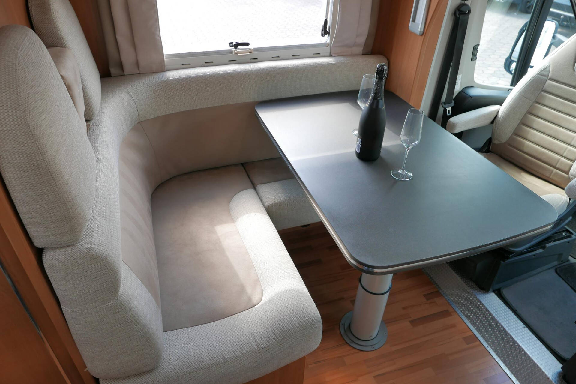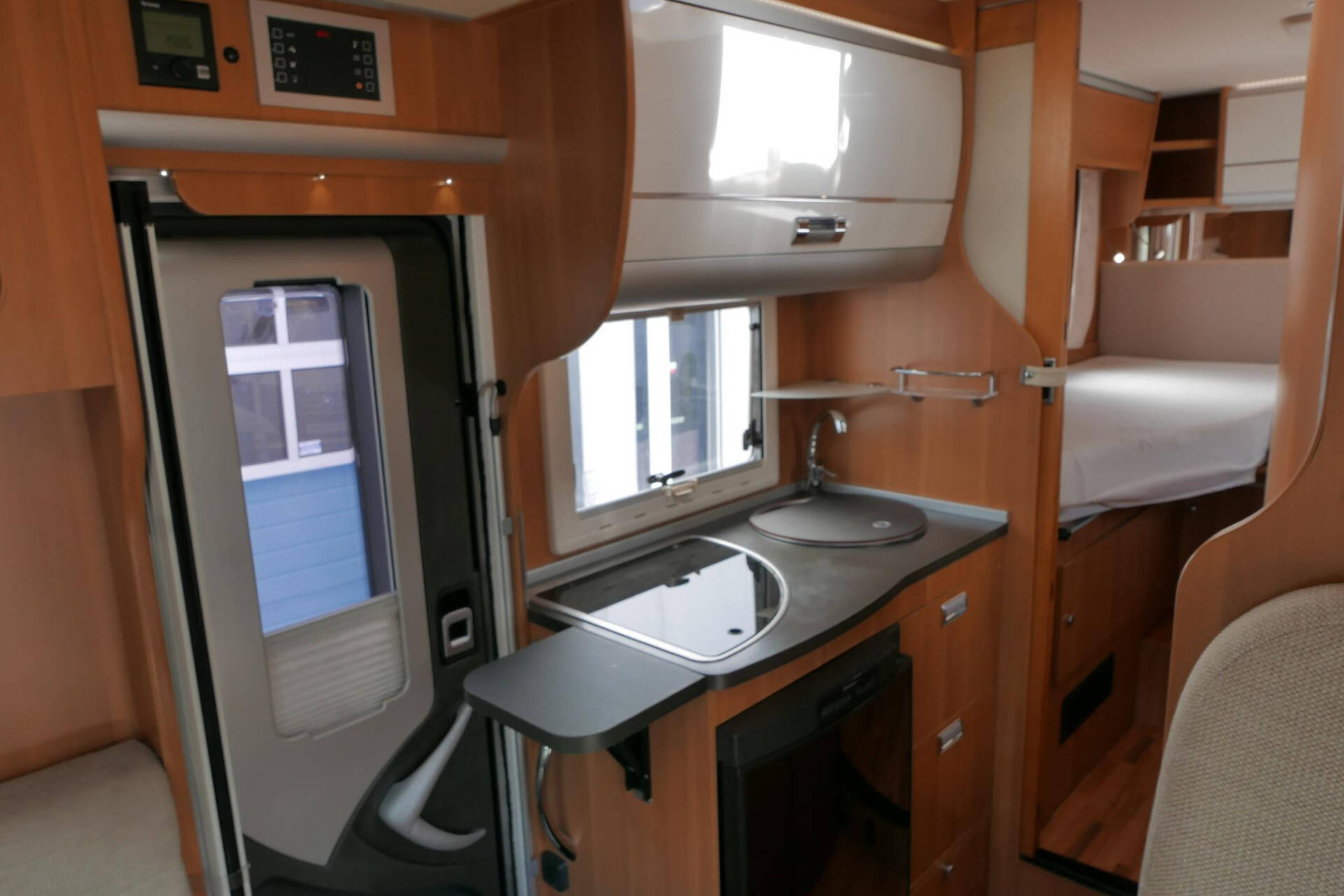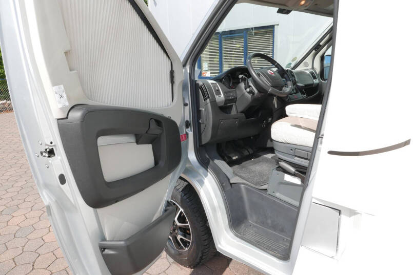 Wanneer u de voorstoelen draait, ontstaat een ruime zithoek. De tafel is te verschuiven en te laten zakken, zodat de ruimte optimaal wordt benut en als extra slaapplaats te gebruiken is. Tevens is deze half integraal uit gerust met een elektrische bedienbaar hefbed voor nog een extra slaapplaats. Het lichte interieur met de witte klepkastjes in combinatie met mooie lichte bekleding geven deze camper een frisse uitstraling. Uiteraard zijn de ramen en toegangsdeur voorzien van horren en verduistering.