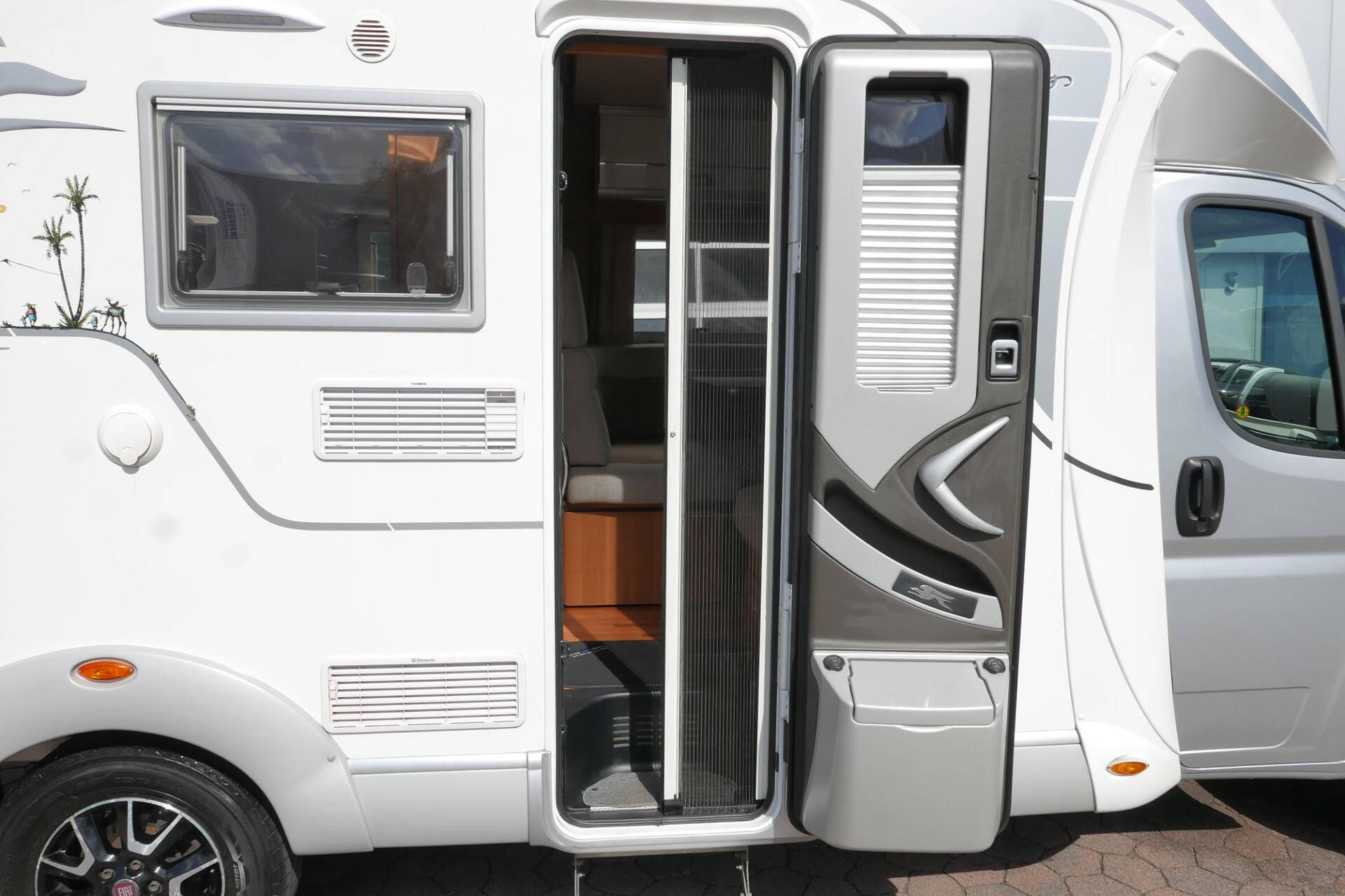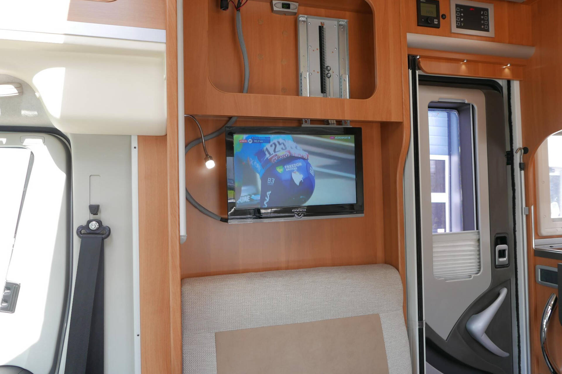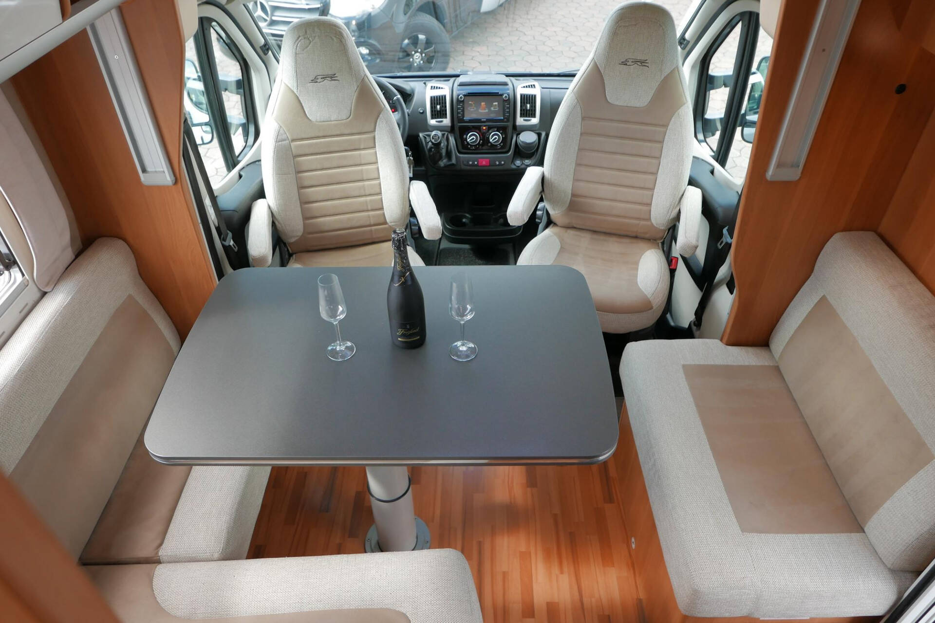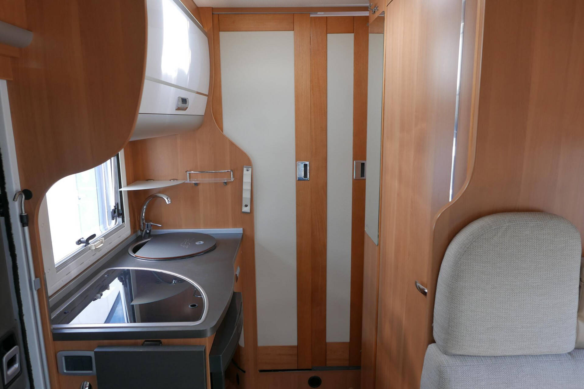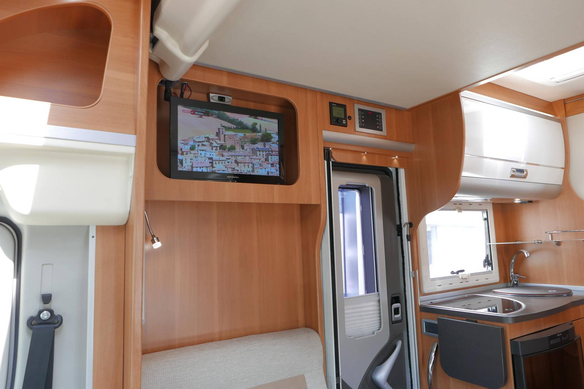 Wanneer u de voorstoelen draait, ontstaat een ruime zithoek. De tafel is te verschuiven en te laten zakken, zodat de ruimte optimaal wordt benut en als extra slaapplaats te gebruiken is. Tevens is deze half integraal uit gerust met een elektrische bedienbaar hefbed voor nog een extra slaapplaats. Het lichte interieur met de witte klepkastjes in combinatie met mooie lichte bekleding geven deze camper een frisse uitstraling. Uiteraard zijn de ramen en toegangsdeur voorzien van horren en verduistering.