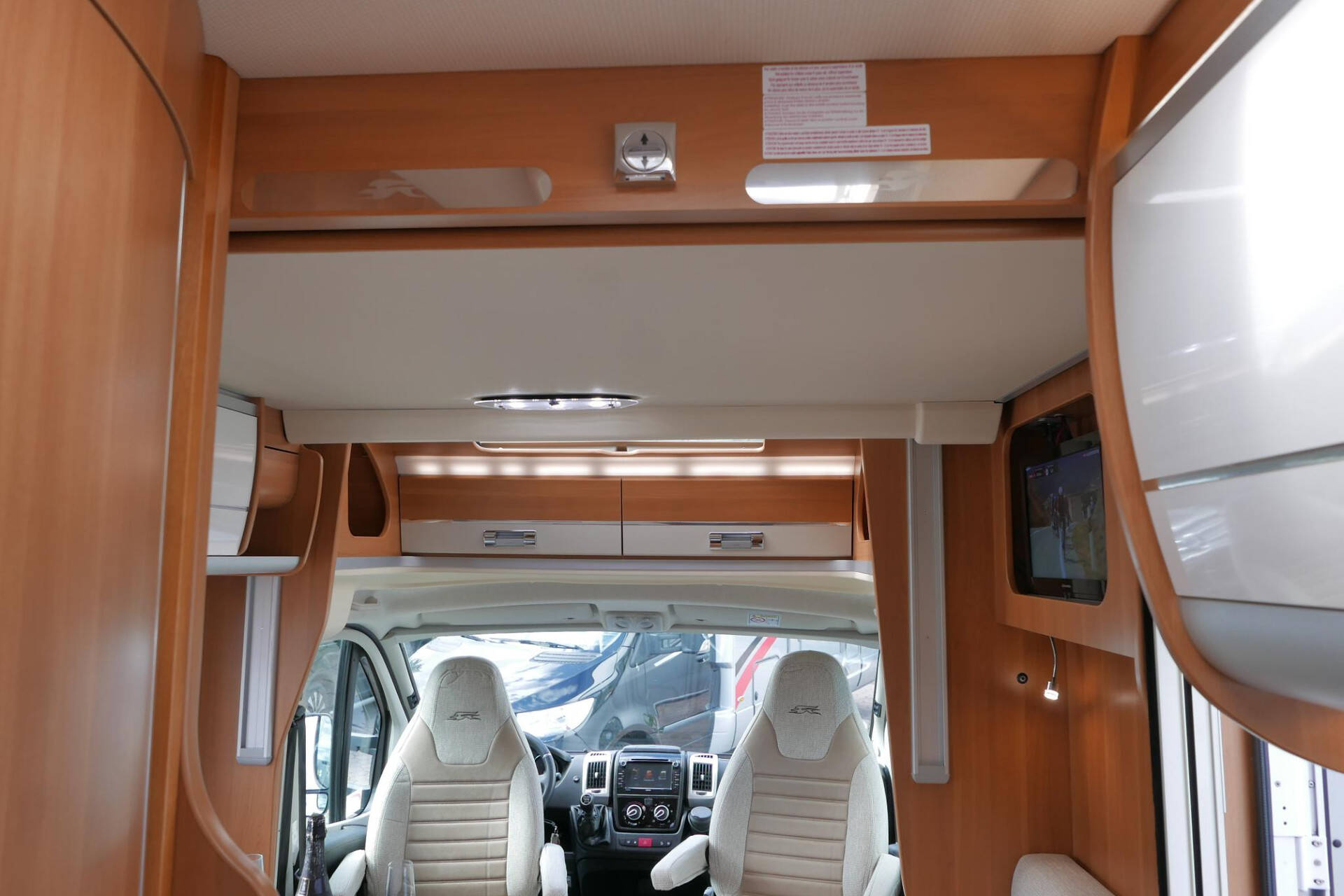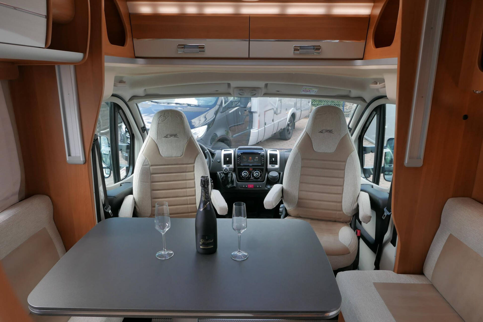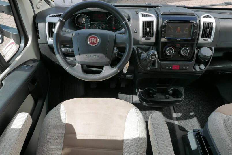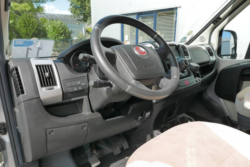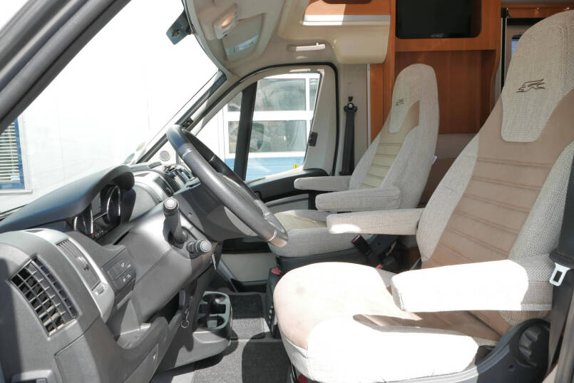 De cabine van deze half-integraalcamper is makkelijk toegankelijk via de 2 cabinedeuren. De cockpit is uitgerust met een lederen stuur, radio/navigatie en achteruitrijcamera en 2 comfortabele Aguti pilotenstoelen die volledig verstelbaar en draaibaar zijn.