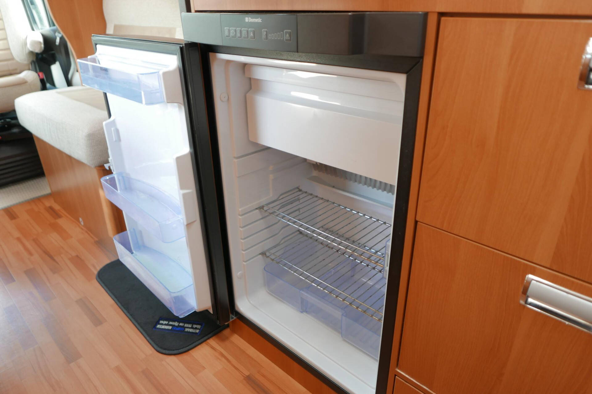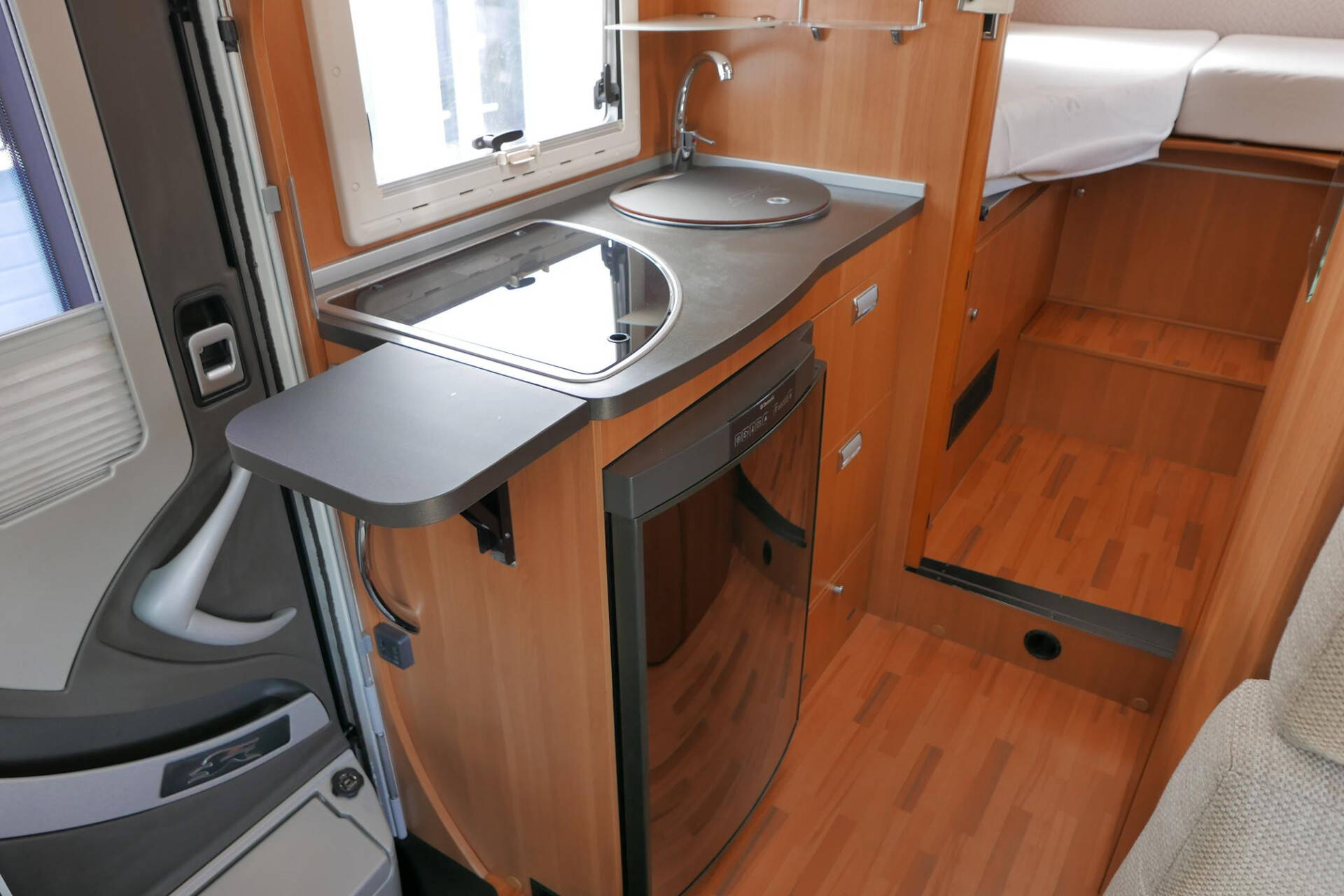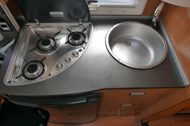 De ruime keuken heeft diverse laden en een 3 pits gasstel. Onder het werkblad vindt u de grote koelkast met vriesvak en automatische omschakeling 230V/12V/gas.