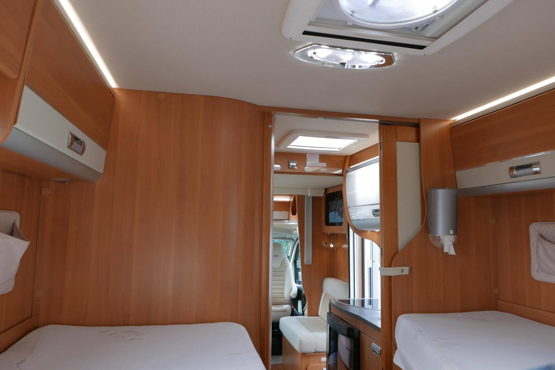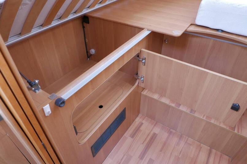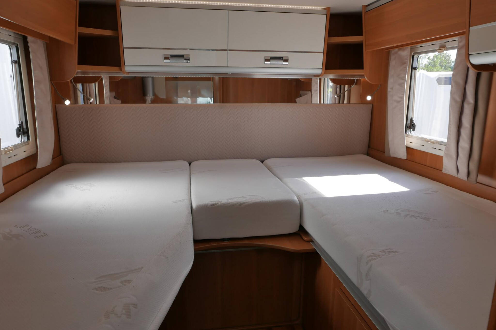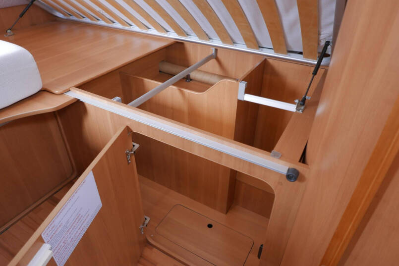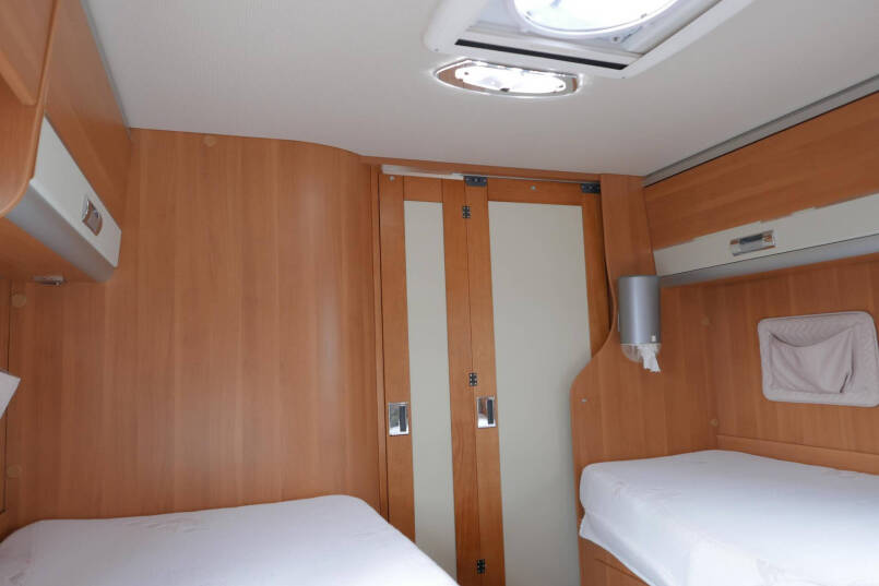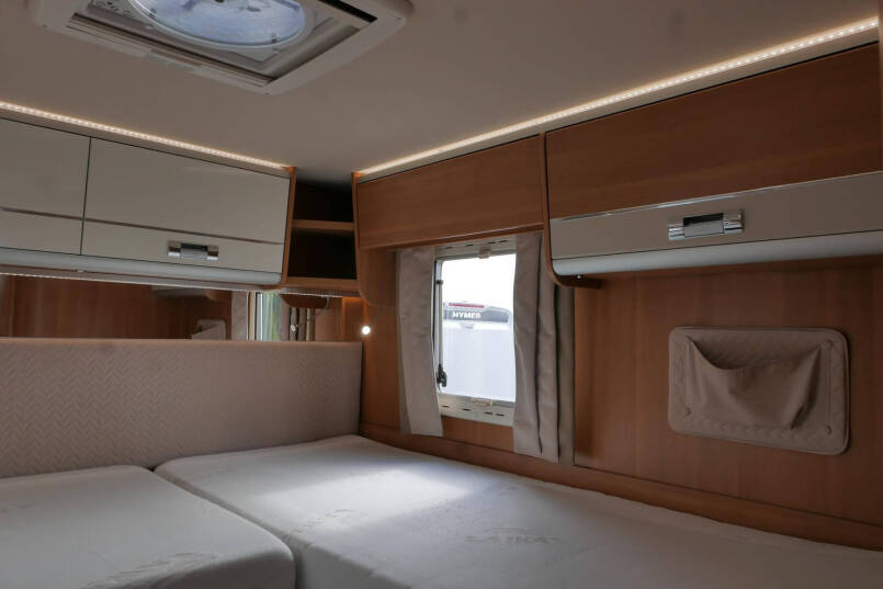 Achterin bevinden zich de 2 enkele lengte bedden. Onder de bedden is aan beide kanten nog meer kastruimte te vinden.