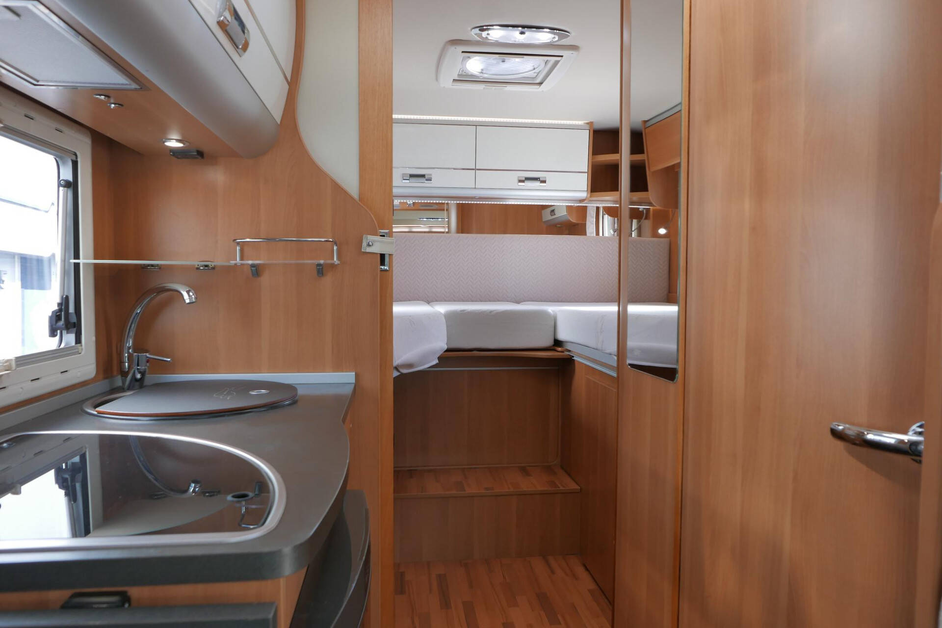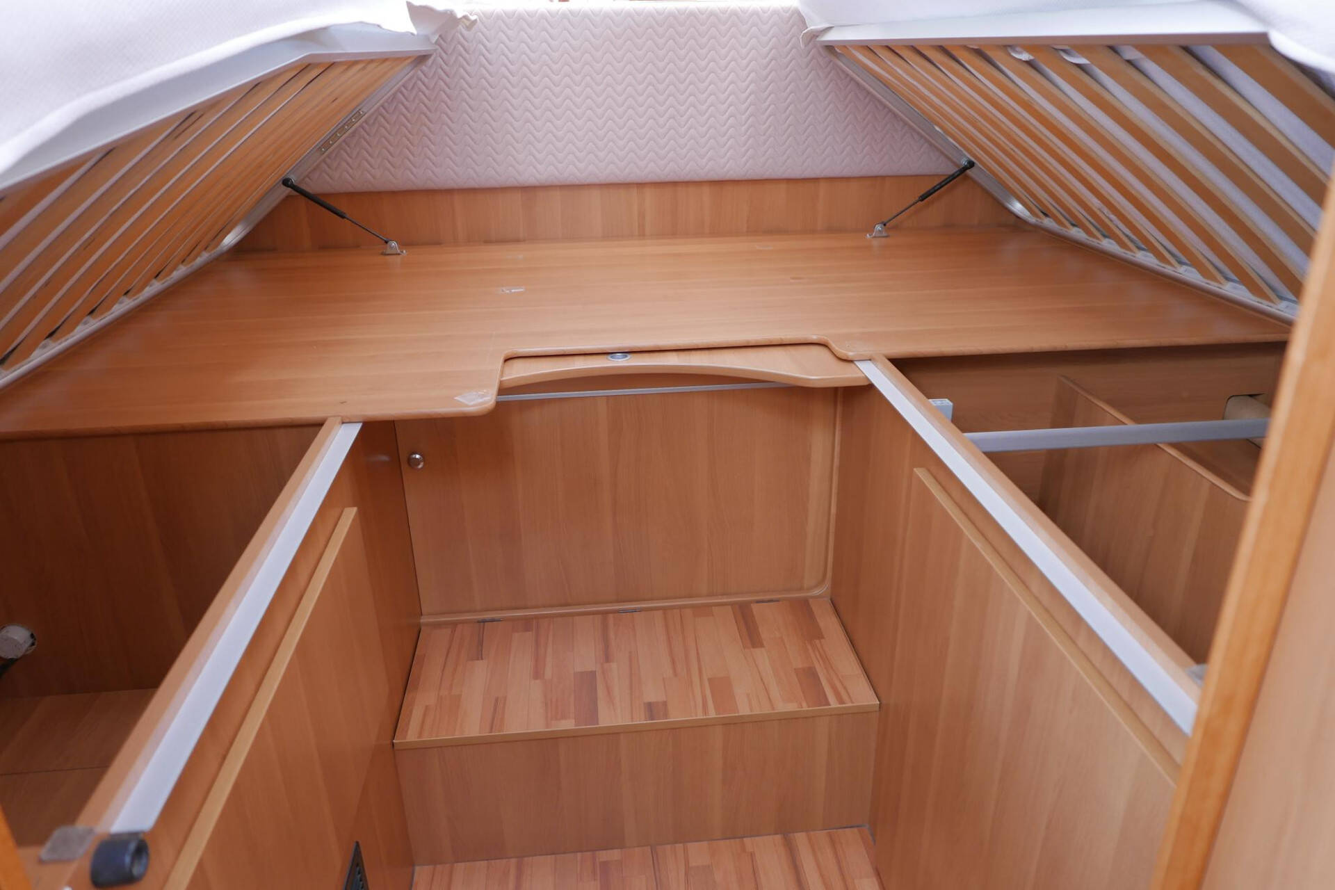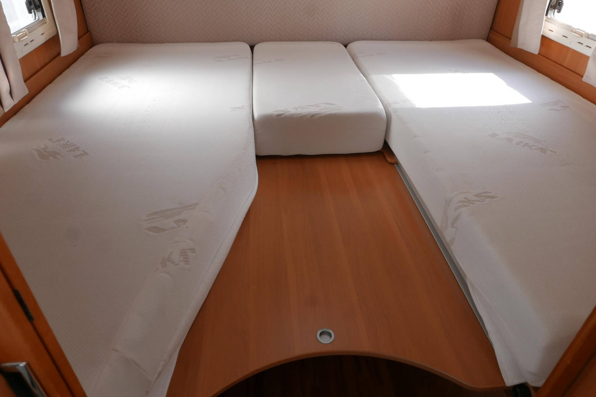 Achterin bevinden zich de 2 enkele lengte bedden. Onder de bedden is aan beide kanten nog meer kastruimte te vinden.