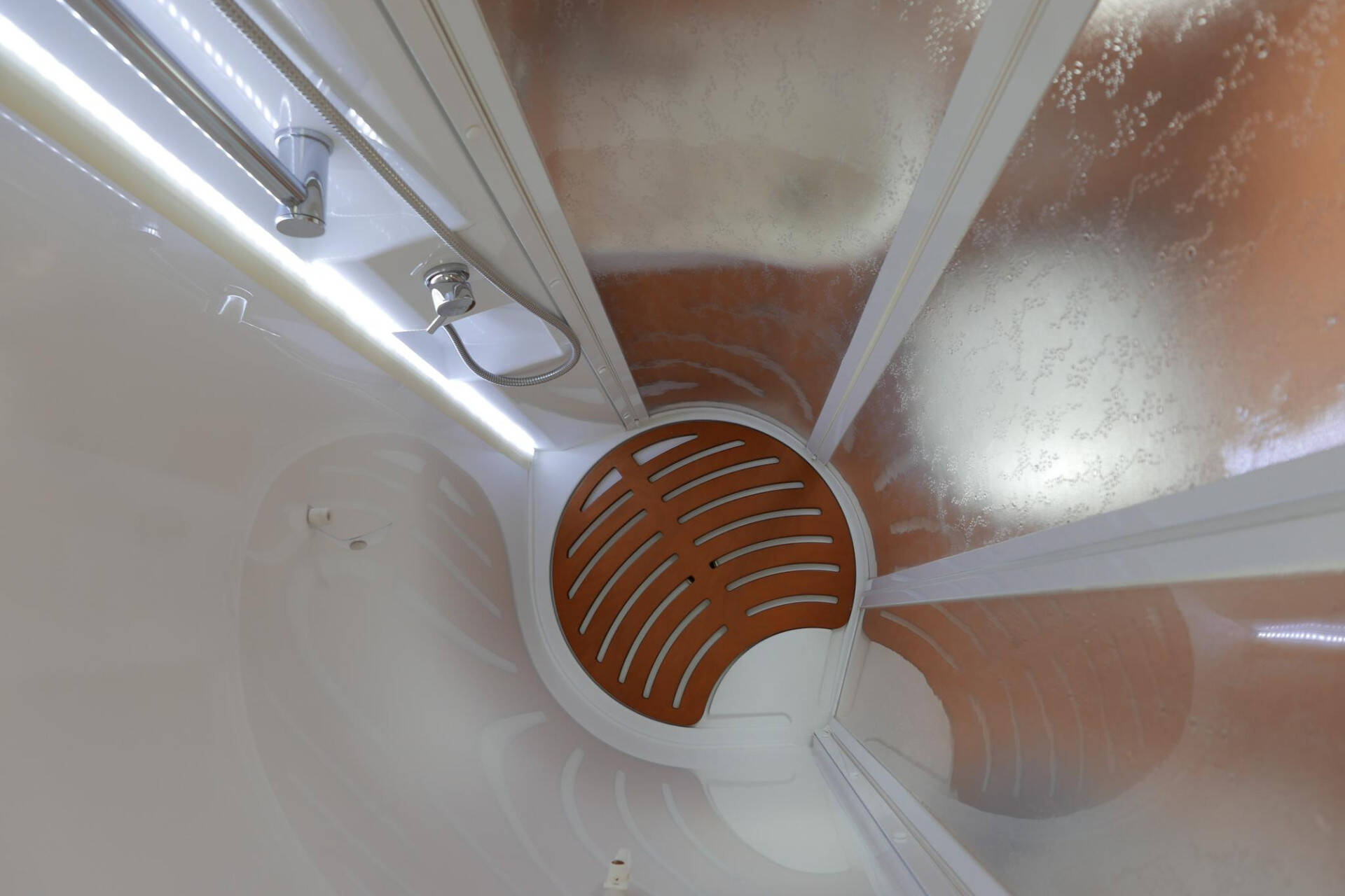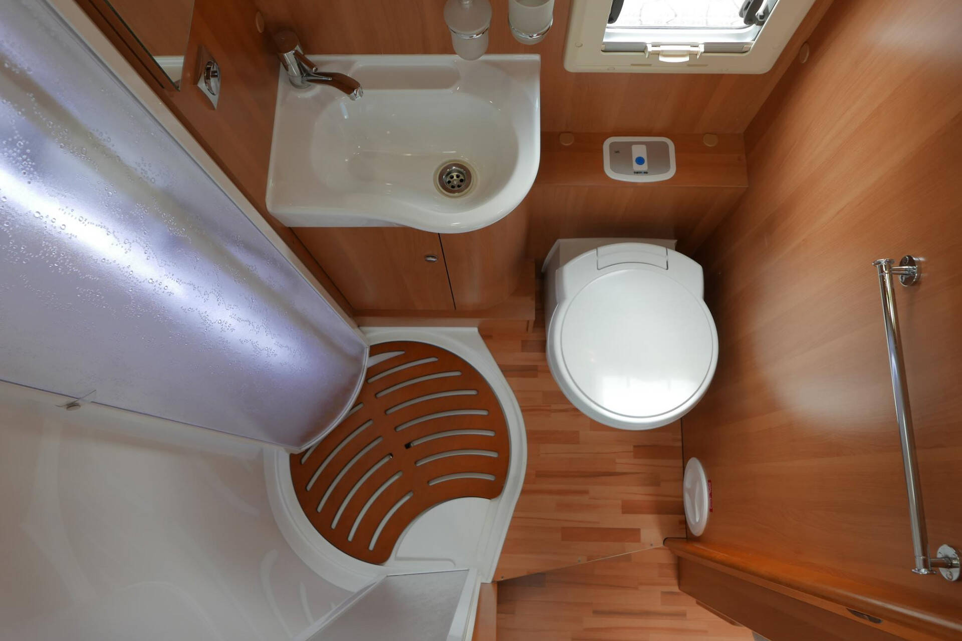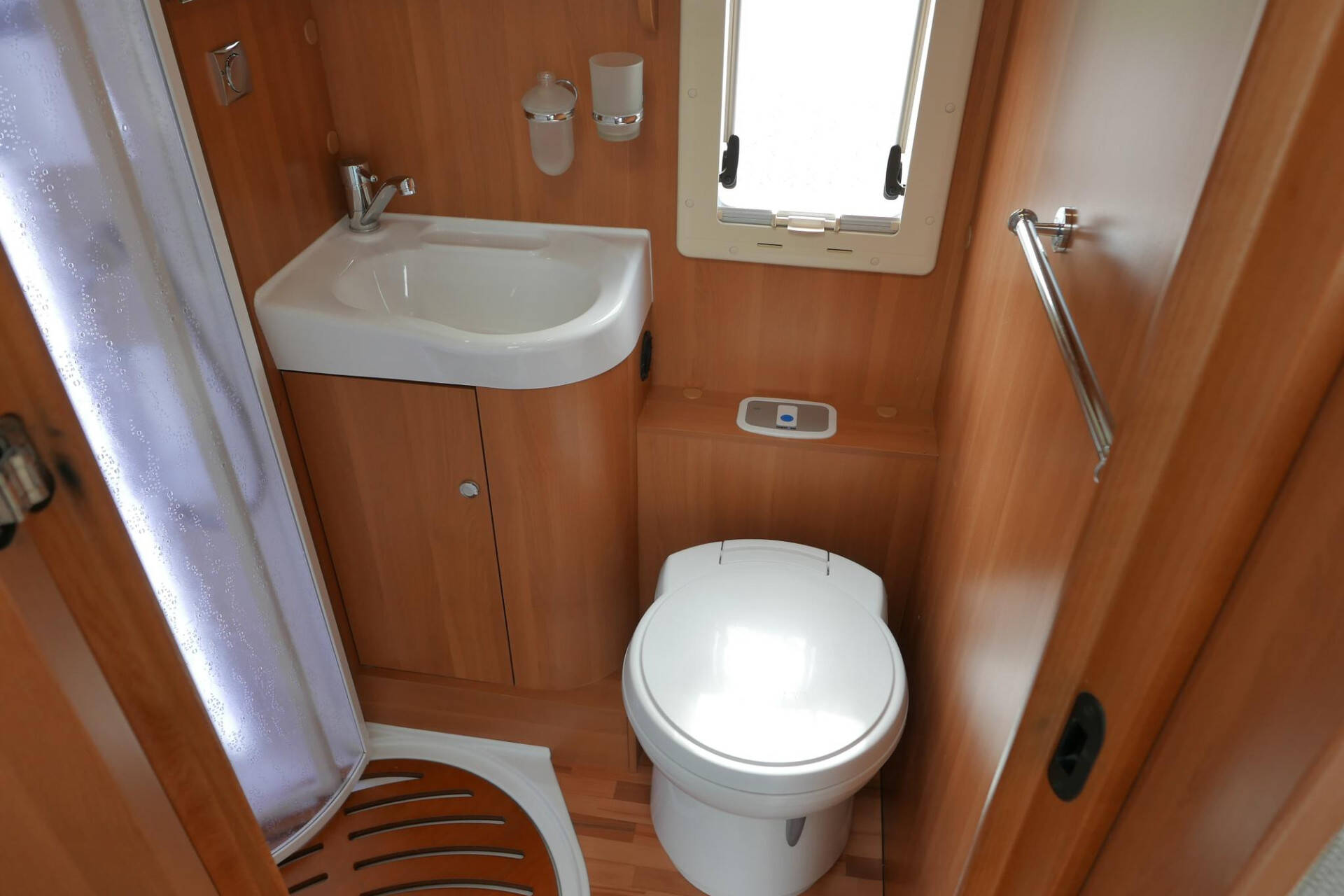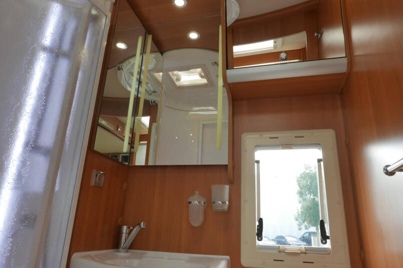 Tegenover de keuken is de gecombineerde douche- en toiletruimte gesitueerd. Zeker wanneer u niet (vaak) in de camper doucht heeft u hierdoor een royale badkamer. Naast de toilet en douche is een wasbak met grote spiegel en diverse kastruimte aanwezig.