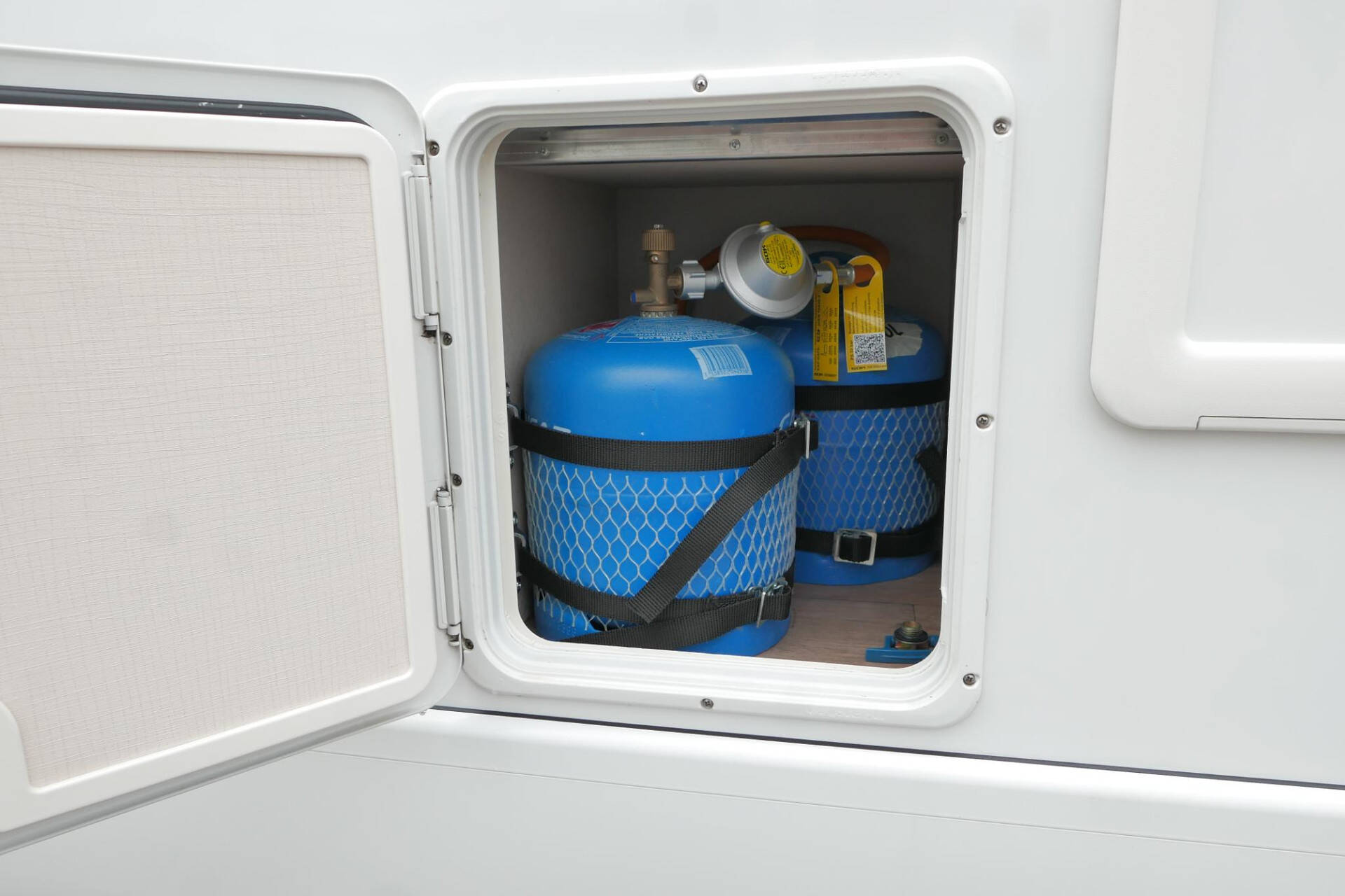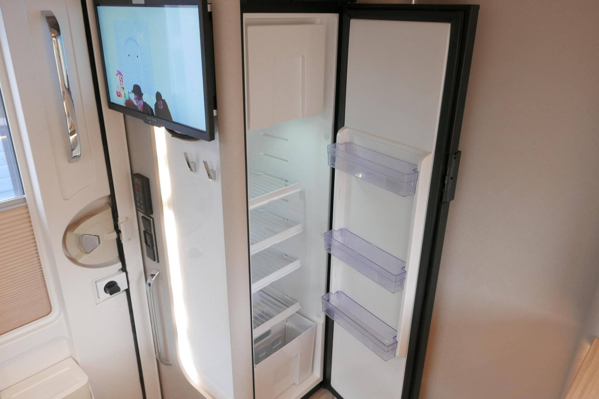 De ruime keuken is voorzien van diverse gelagerde boodschappenladen en een 3 pits gasstel. Hier tegenover vindt u de hoge compressor koelkast 152 l met apart vriesvak.