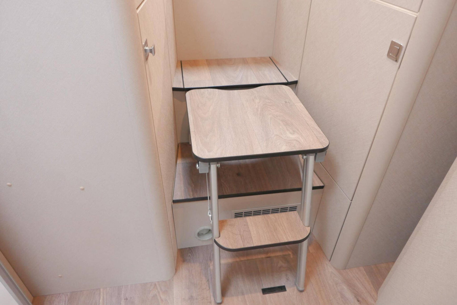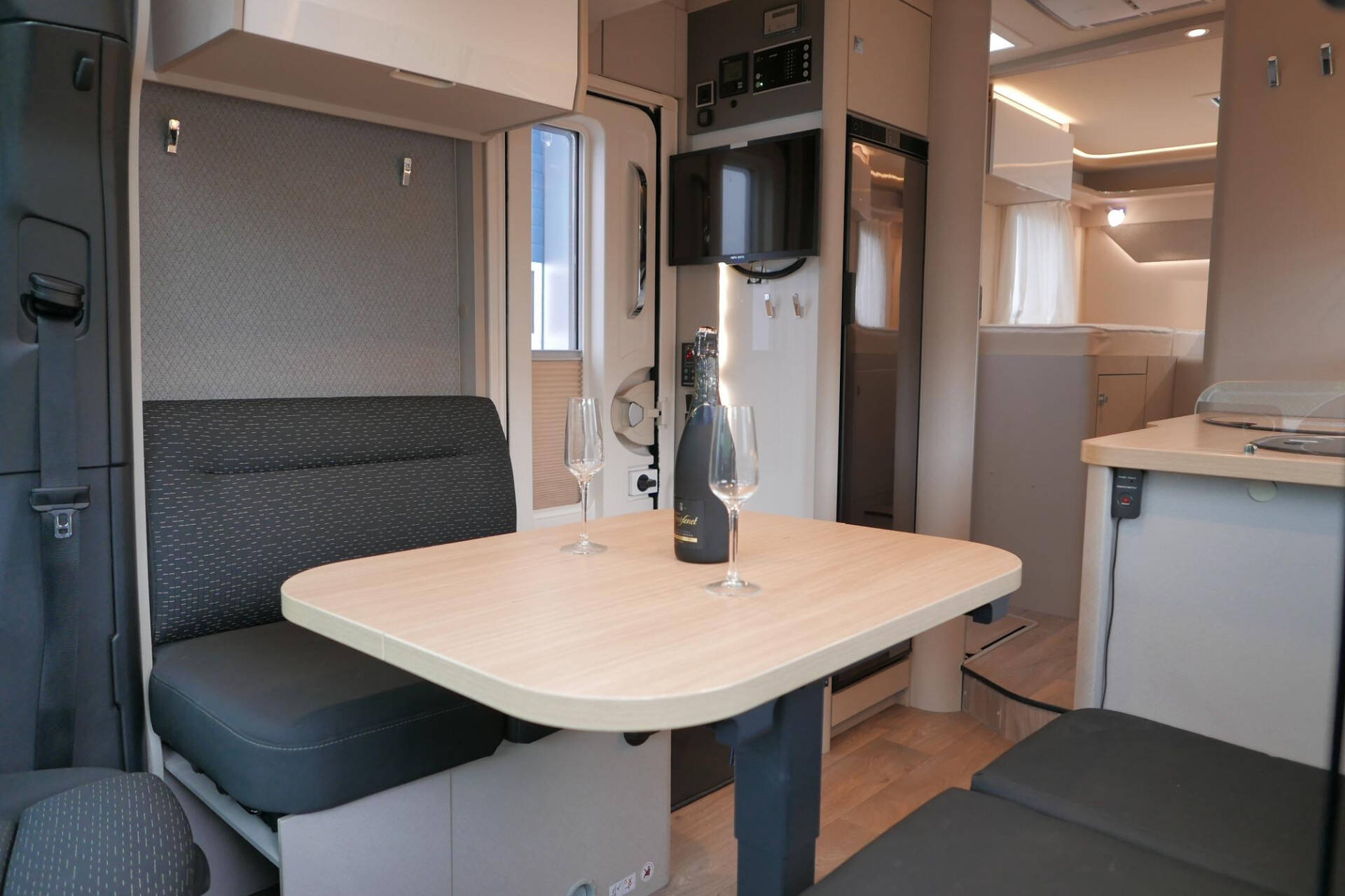 Door de voorstoelen te draaien ontstaat een ruime en gezellige face to face zit. Het Tip Printedak meubeldecor in combinatie met de luxe Korfu bekleding geven de woonruimte een moderne uitstraling. Boven de zit hoek is een extra 2 persoons elektrische hefbed. De 110 liter schoon- en 100 liter vuilwatertank zijn onder de vloer verwerkt. Uiteraard zijn alle ramen en deuren voorzien van horren en plisséverduistering.