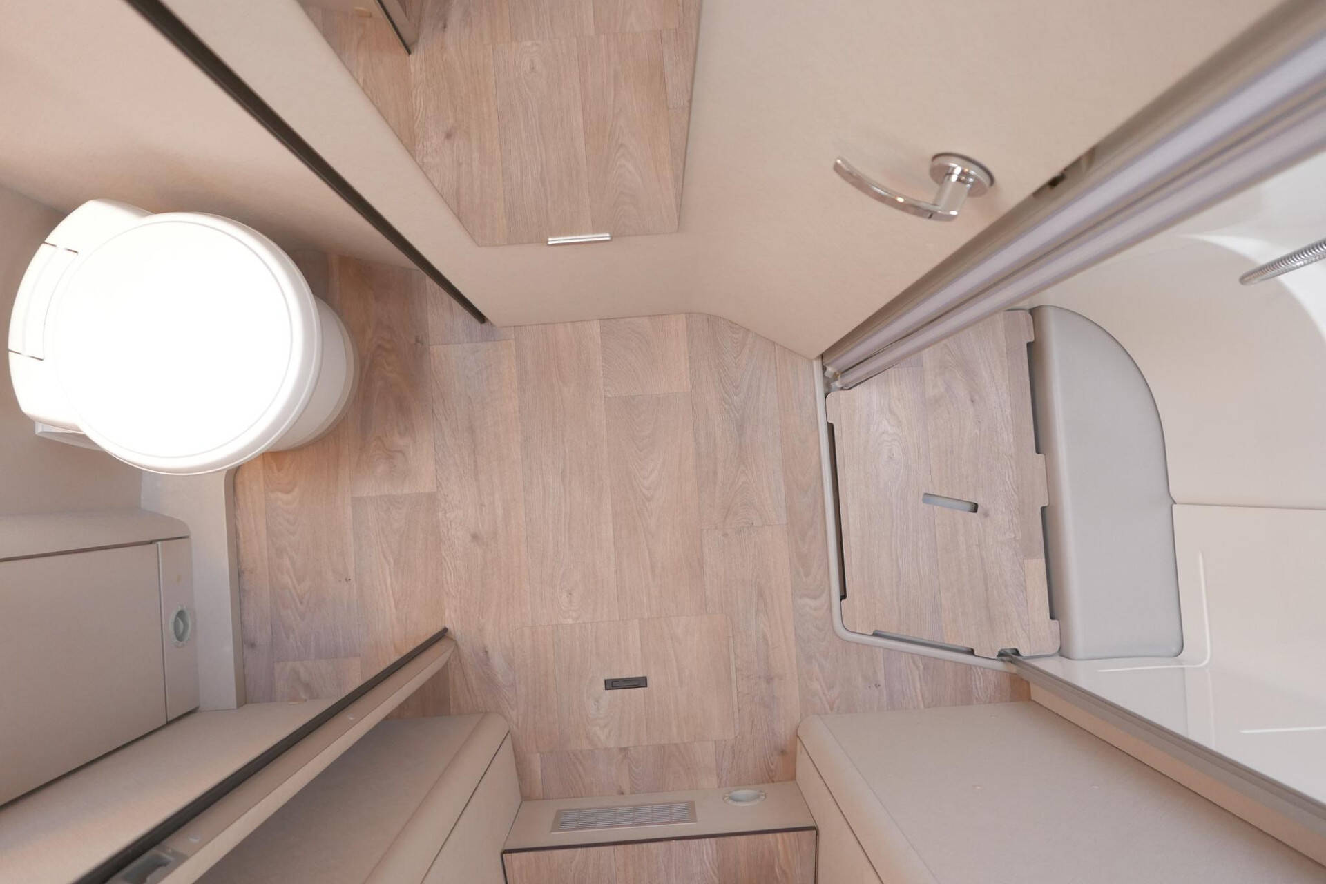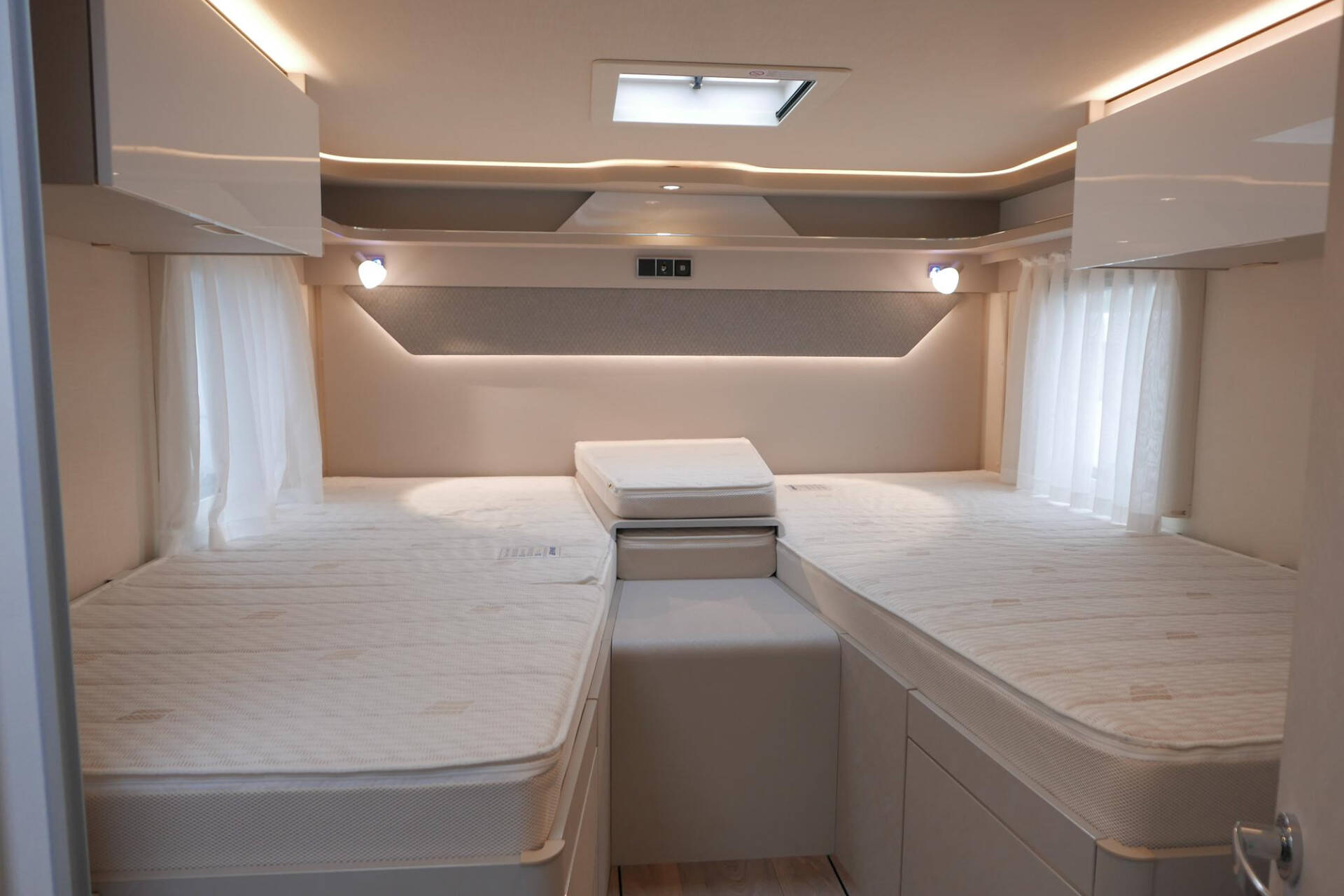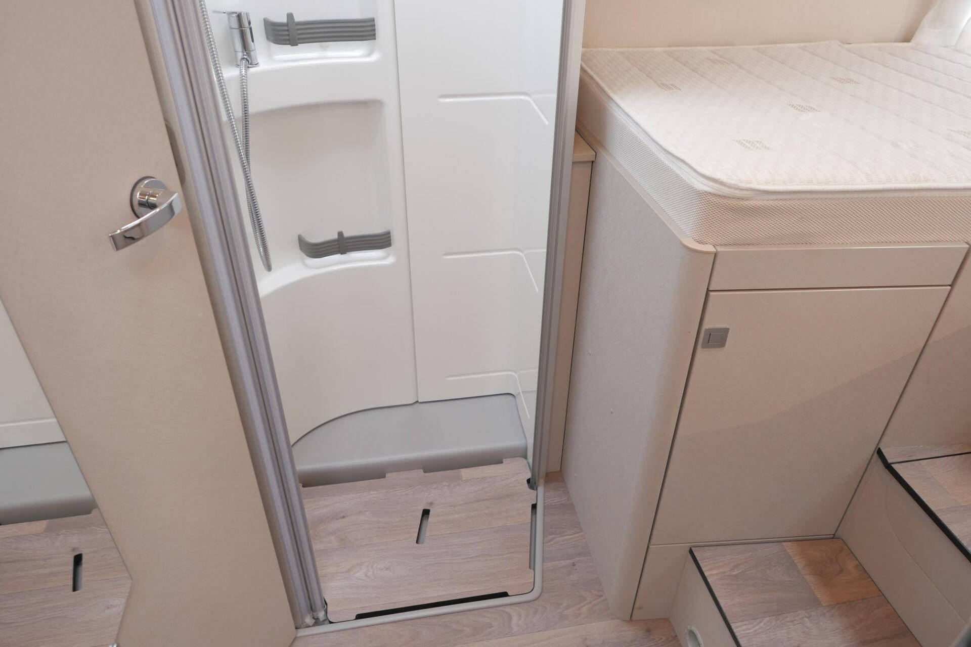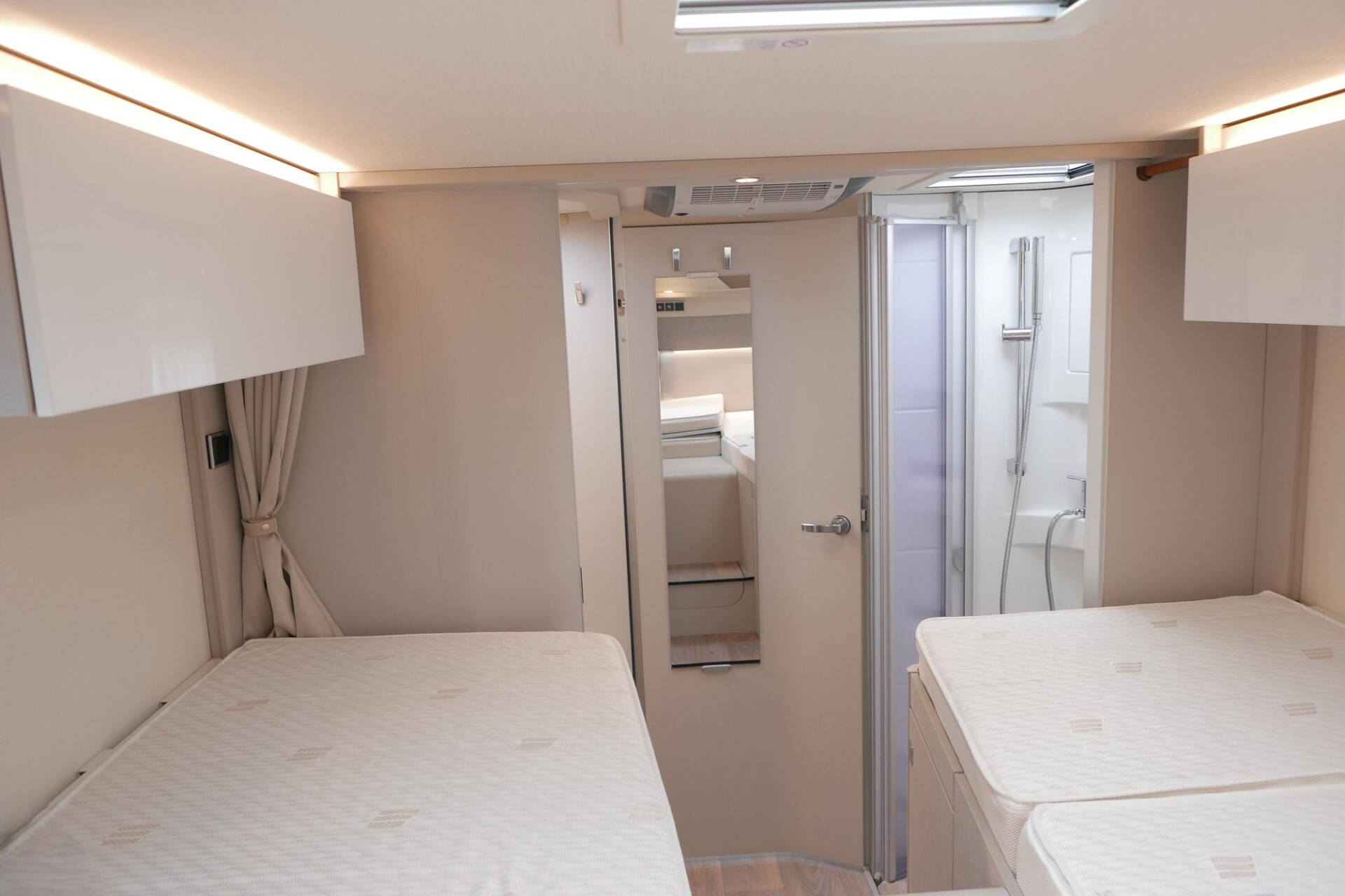 Achterin bevinden zich de aparte douche en toilet en de enkele bedden. Doormiddel van de tussendeur is deze ruimte af te sluiten van het woongedeelte voor extra privacy. De ruime toiletruimte is voorzien van toilet en wasbak, grote spiegel en kastjes. Hier tegenover vindt u de douchecabine. Onder het bed is extra kastruimte aanwezig.