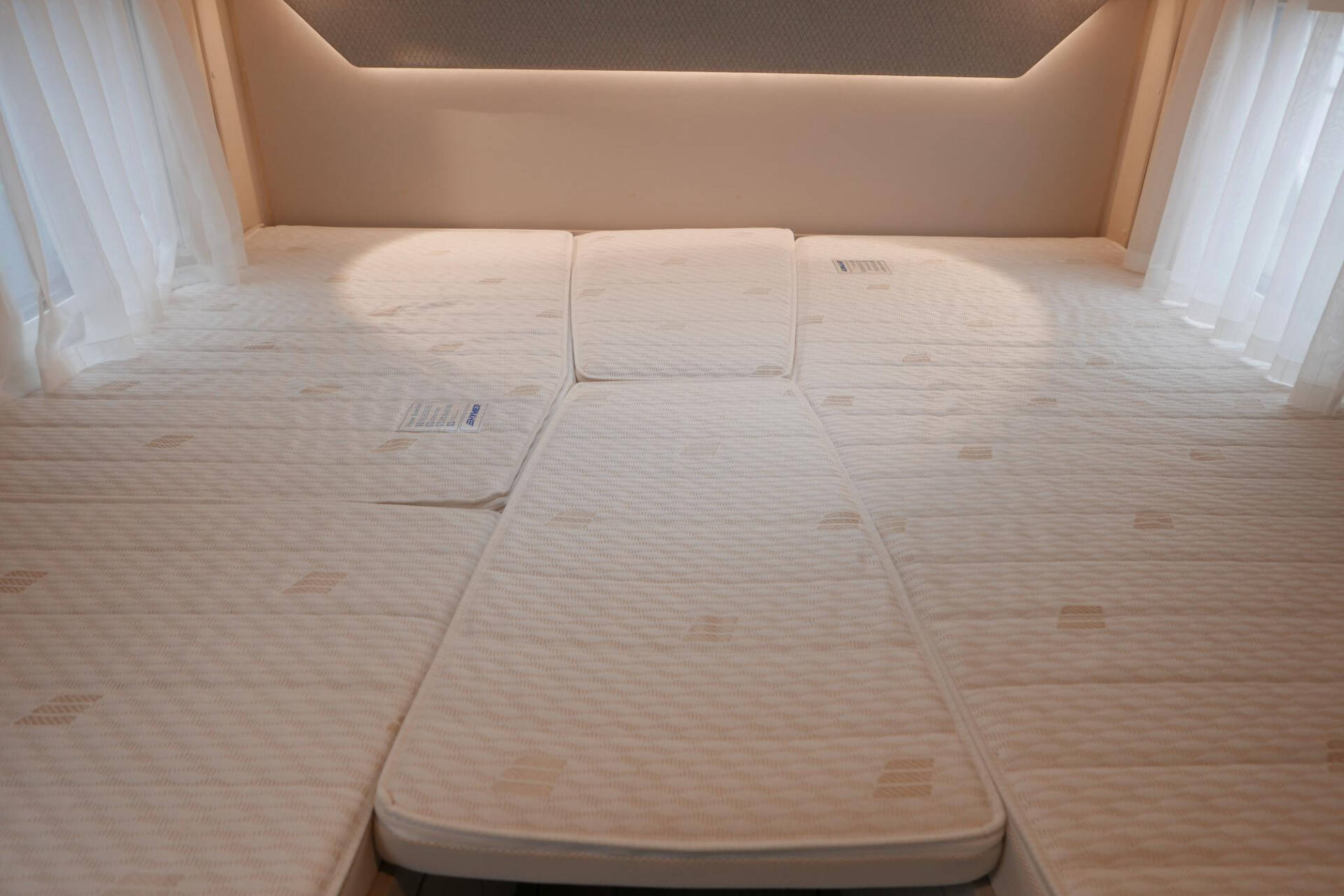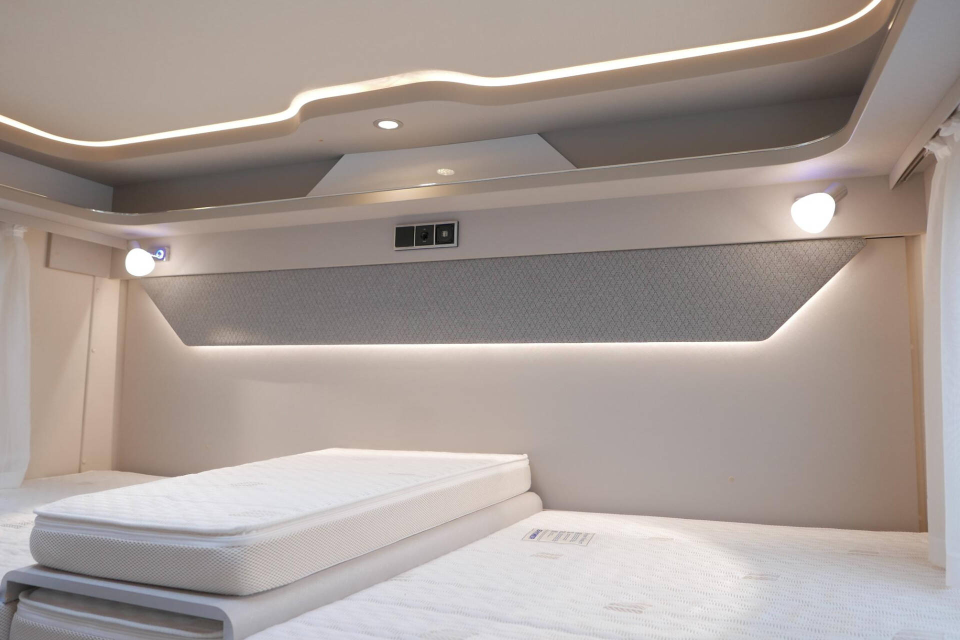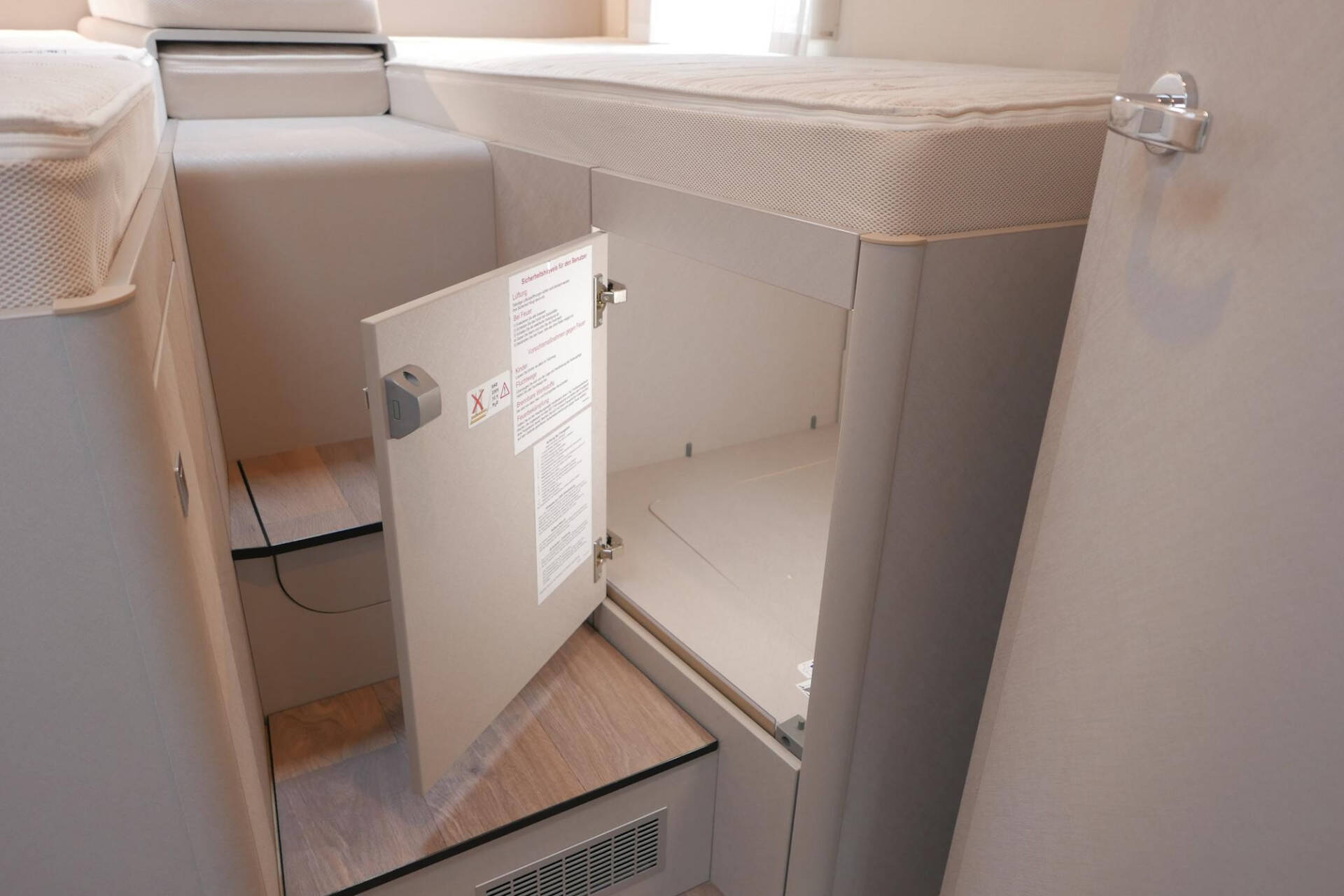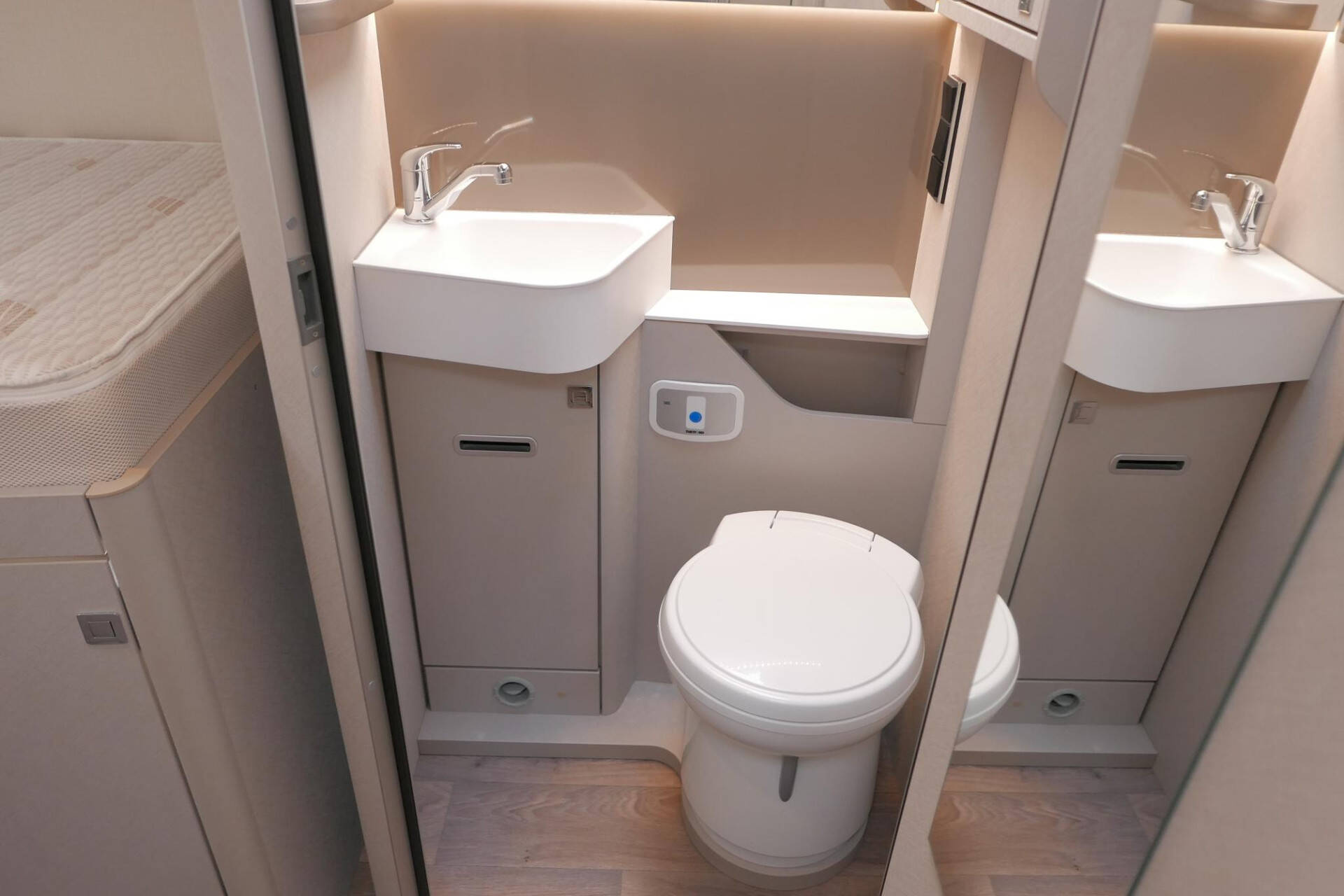 Achterin bevinden zich de aparte douche en toilet en de enkele bedden. Doormiddel van de tussendeur is deze ruimte af te sluiten van het woongedeelte voor extra privacy. De ruime toiletruimte is voorzien van toilet en wasbak, grote spiegel en kastjes. Hier tegenover vindt u de douchecabine. Onder het bed is extra kastruimte aanwezig.