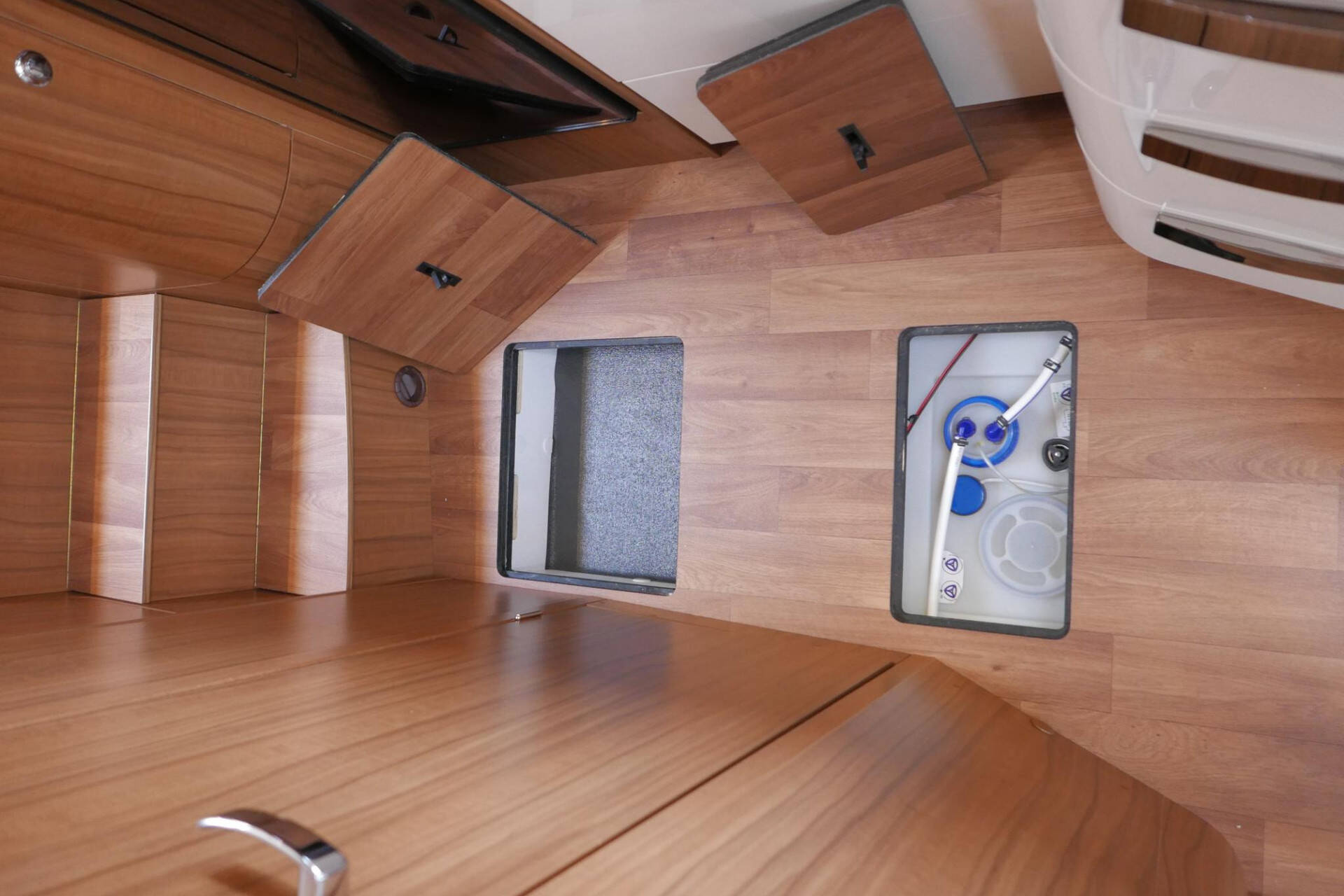 Wanneer u de voorstoelen draait, ontstaat een royale L-zithoek met een zijbankje. De tafel is in de lengte en breedte verstelbaar en 360° draaibaar. Het Palitino Apfel meubeldecor met luxe stof bekleding geven deze camper een luxe en ruime uitstraling. Door het AL-KO chassis beschikt deze camper over een volledig vlakke vloer met extra grote opbergvakken. Ook de 160 l schoon- en 140 l vuilwatertank zijn in de mee verwarmde bodem verwerkt. Uiteraard zijn alle ramen en de toegangsdeur voorzien van horren en plisséverduistering.